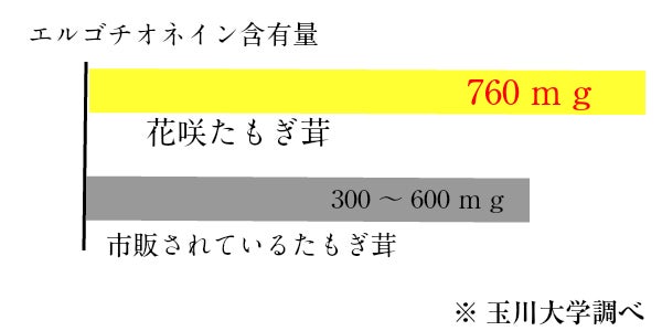 特に、抗酸化作用が強いと言われるエルゴチオネインについては、大学の研究機関に調べていただき、一般的に市販されているたもぎ茸に比べて倍近い含有量が検出されました。