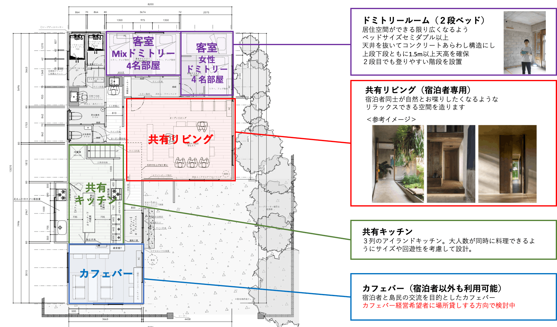 そんな島民の方々と旅行で来る方々が一緒に時間を共有できるカフェバーを宿泊施設に併設させようと考えています。そこで生まれる出会いを通じて、島民の方の文化やスキルを継承して移住するような人が出てきたり、新しい事業が生まれたり、地方創生のきっかけになるような場になれたら大変嬉しく思います。
