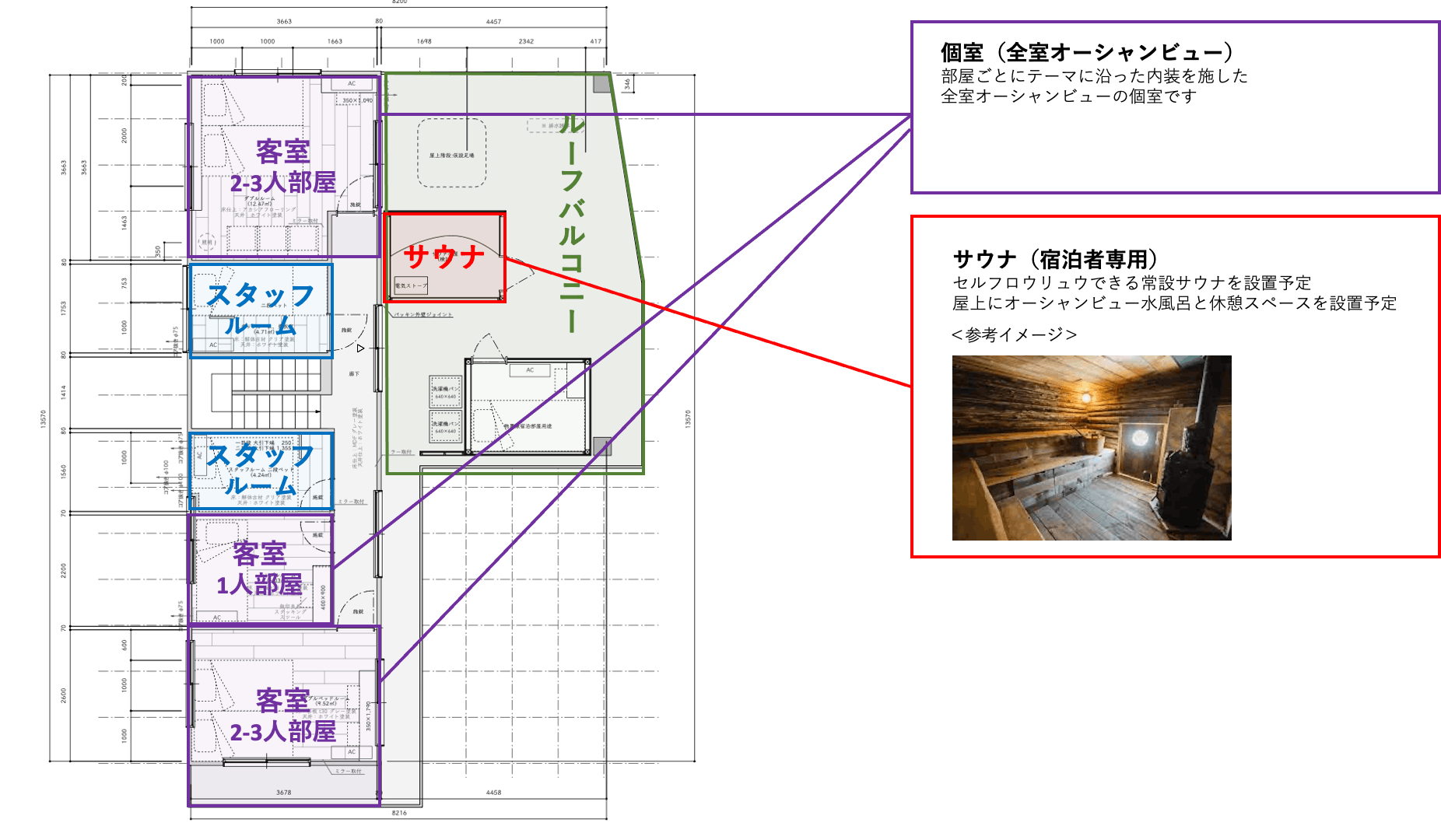 またゲストハウスが汚いというイメージも払拭できるよう、清潔感があり居心地の良い空間創りを建築家の四ツ谷氏と一緒に励んでいます。またドミトリー(相部屋)だけでなく、プライベートもしっかり確保できる個室(全室オーシャンビュー)もご用意する予定です。