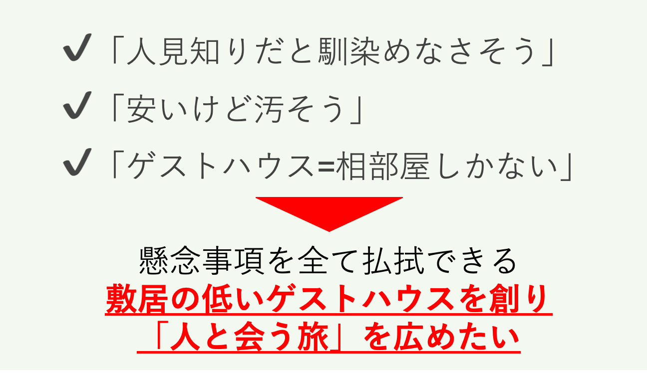 色々マイナスイメージがあると思います。それらを全て払拭して敷居の低いゲストハウスを創ります。