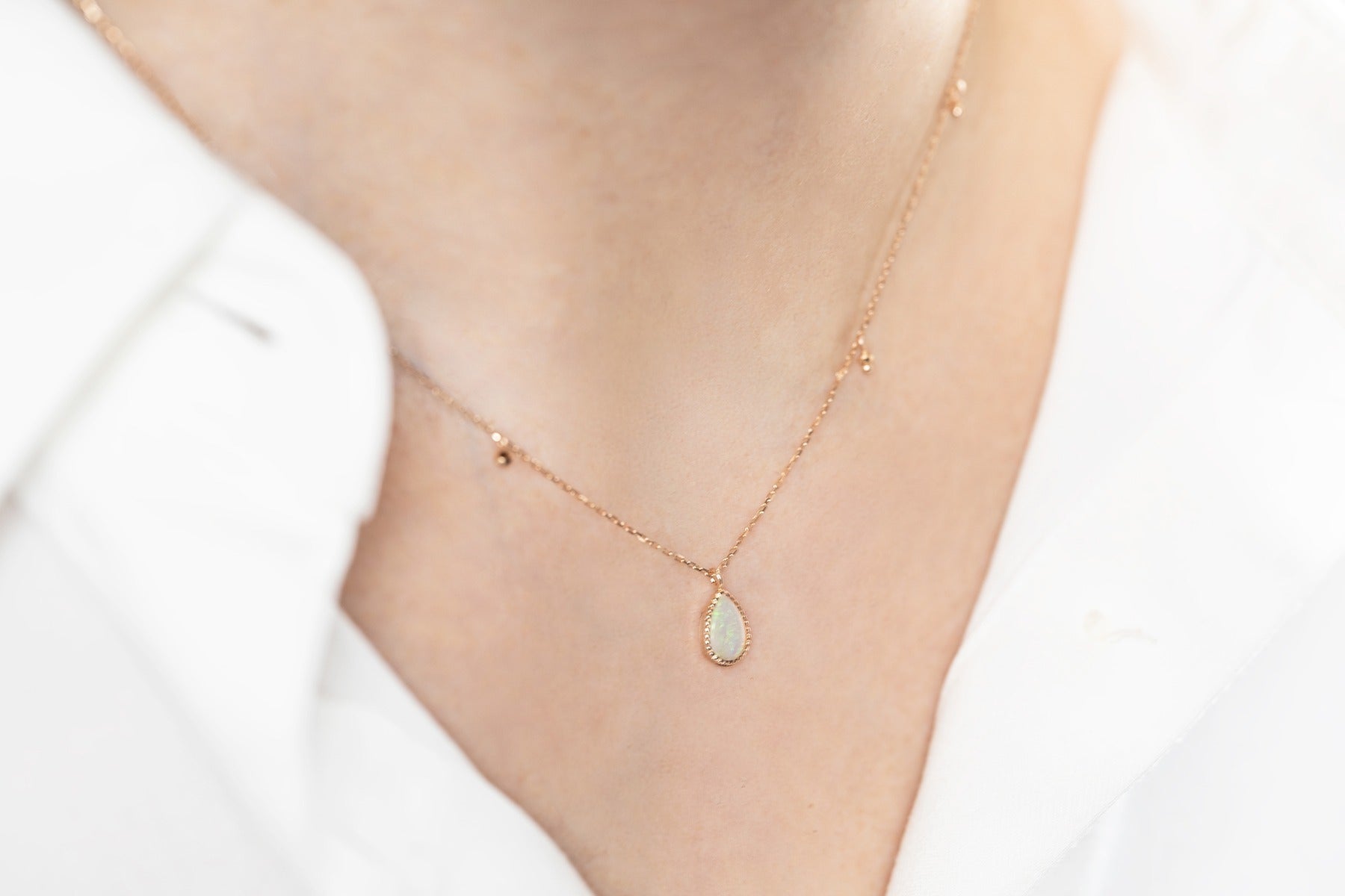そのため、身につける服の色合いによっても様々な表情を見せてくれます。オパールは下地(服等)の色が黒だと写真のような濃い色合いになり、下地の色が白だと淡い色合いになります。※天然石のため石それぞれに個性がございますので、多少の色の違いはございますのでご注意ください