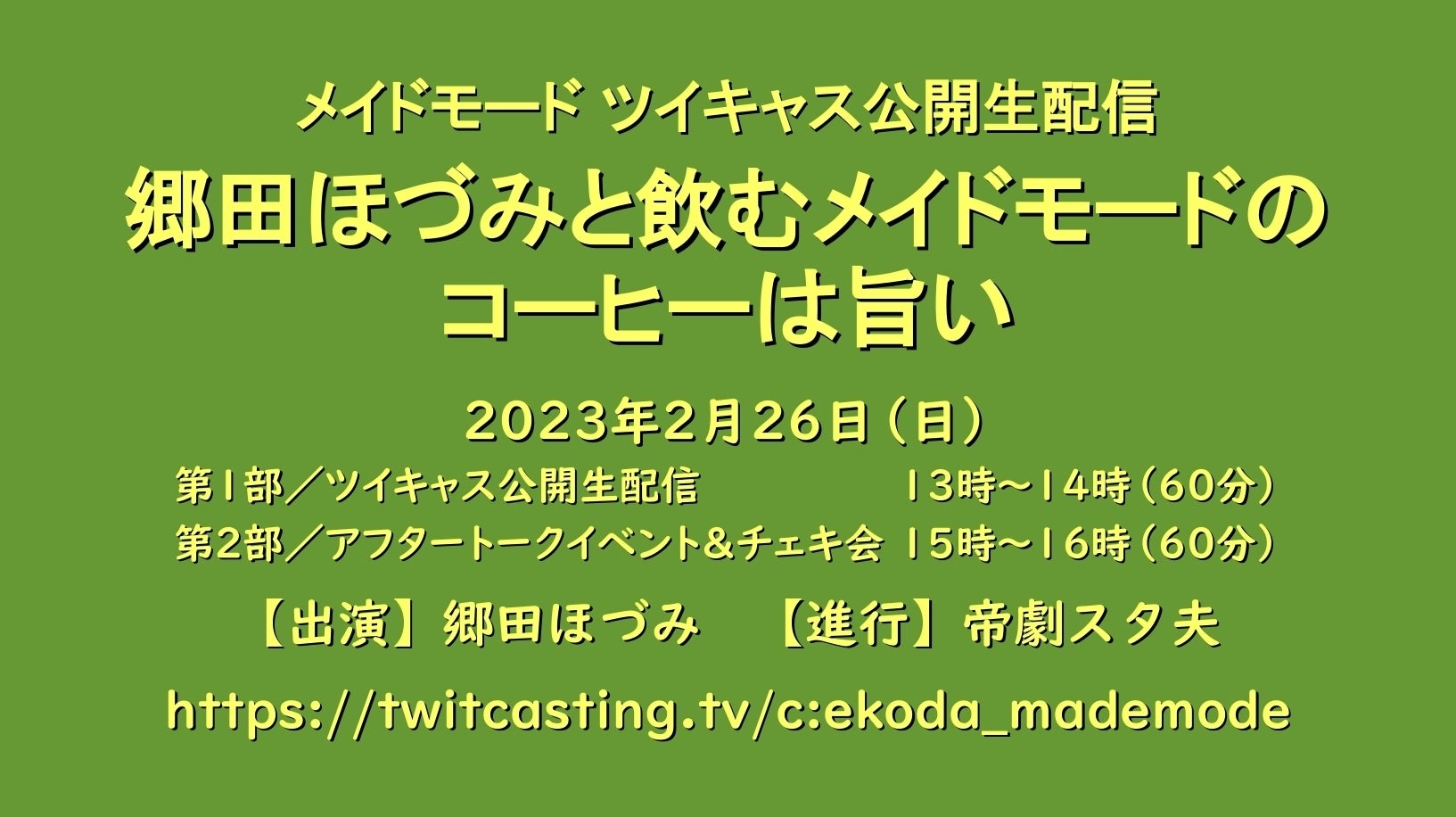2023/02/26 08:15メイドモードのイベントがどういうものか、実際に体験してみませんか?本日2月26日(日)13時より「郷田ほづみと飲むメイドモードのコーヒーは旨い」をツイキャスにて無料生配信いたします。made mode (@c:ekoda_mademode) さんのライブ - ツイキャス (twitcasting.tv) メイドモードがやりたいことが伝われば幸いです。 もっと見る