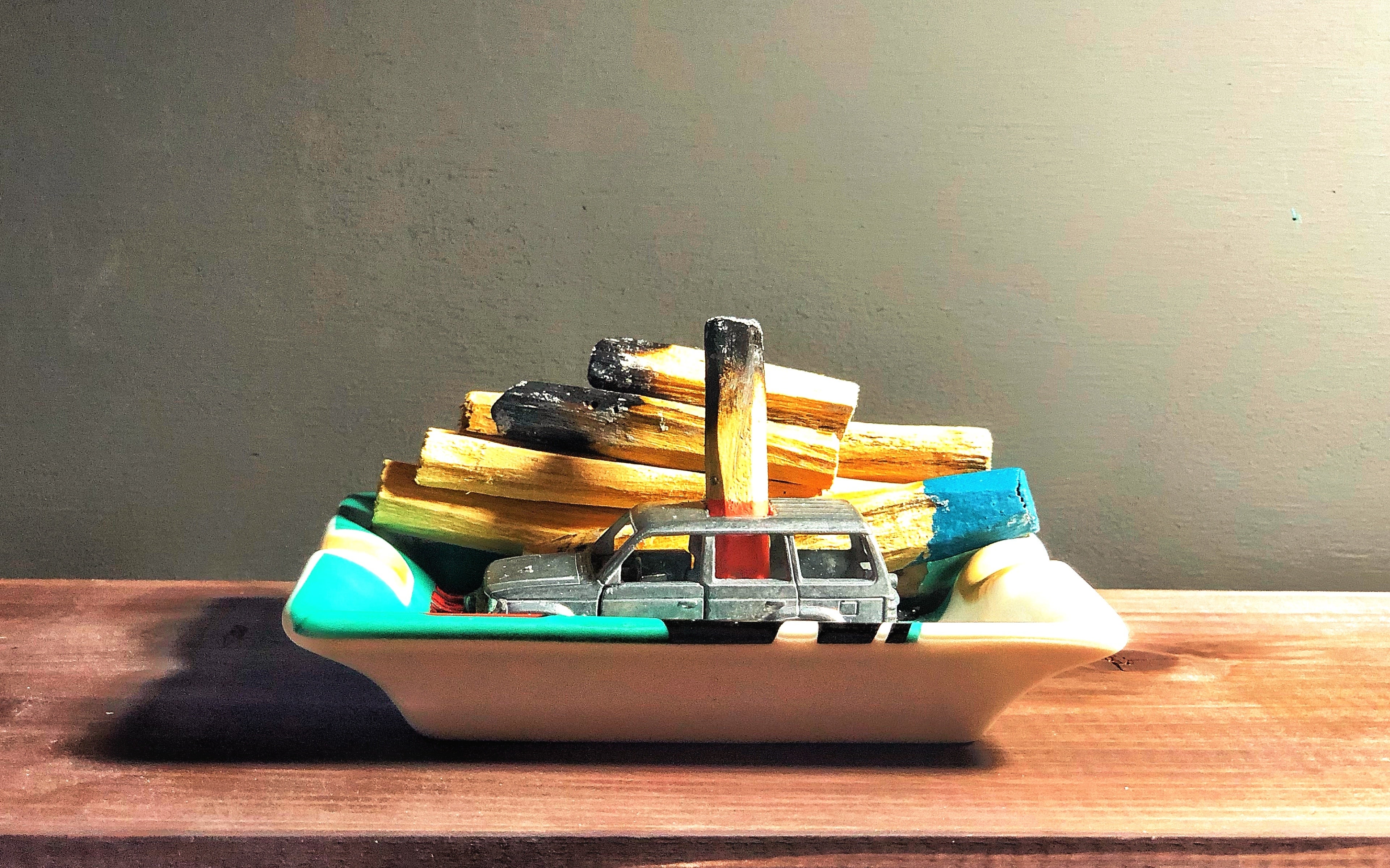 そんなこんなで月日が経ち、飲みに誘われ大学時代からの友人宅へ足を運んだ際、彼は「これお洒落じゃない?めっちゃ良い匂いでさ」と火の点いたパロサントを片手に部屋の中をおもむろに歩き回り、ひとしきり煙らせたのちパロサントを金属の土台へと戻しました。そこでコレだ!となったのです。鉄を主な素材としているミニカーは、サイズ的にもパロサントの土台として正にぴったりでした。そうして、「鉄ミニカ×パロサント」で何か面白い事が出来るんじゃないか...????」と考えた結果、TKR Garageは誕生しました。