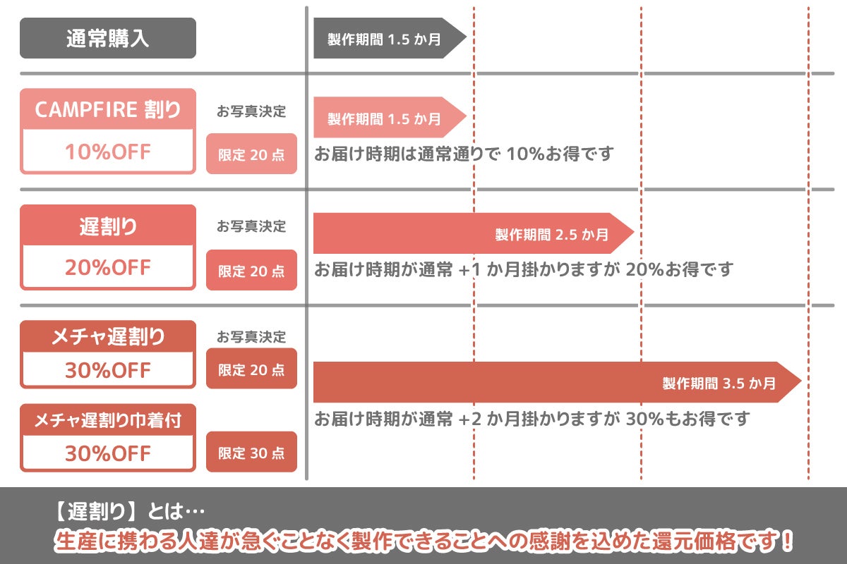 今回キャンペーンとしてCAMPFIRE割に加え、遅割りの仕組みを取り入れた3種類の割引をご用意いたしました。