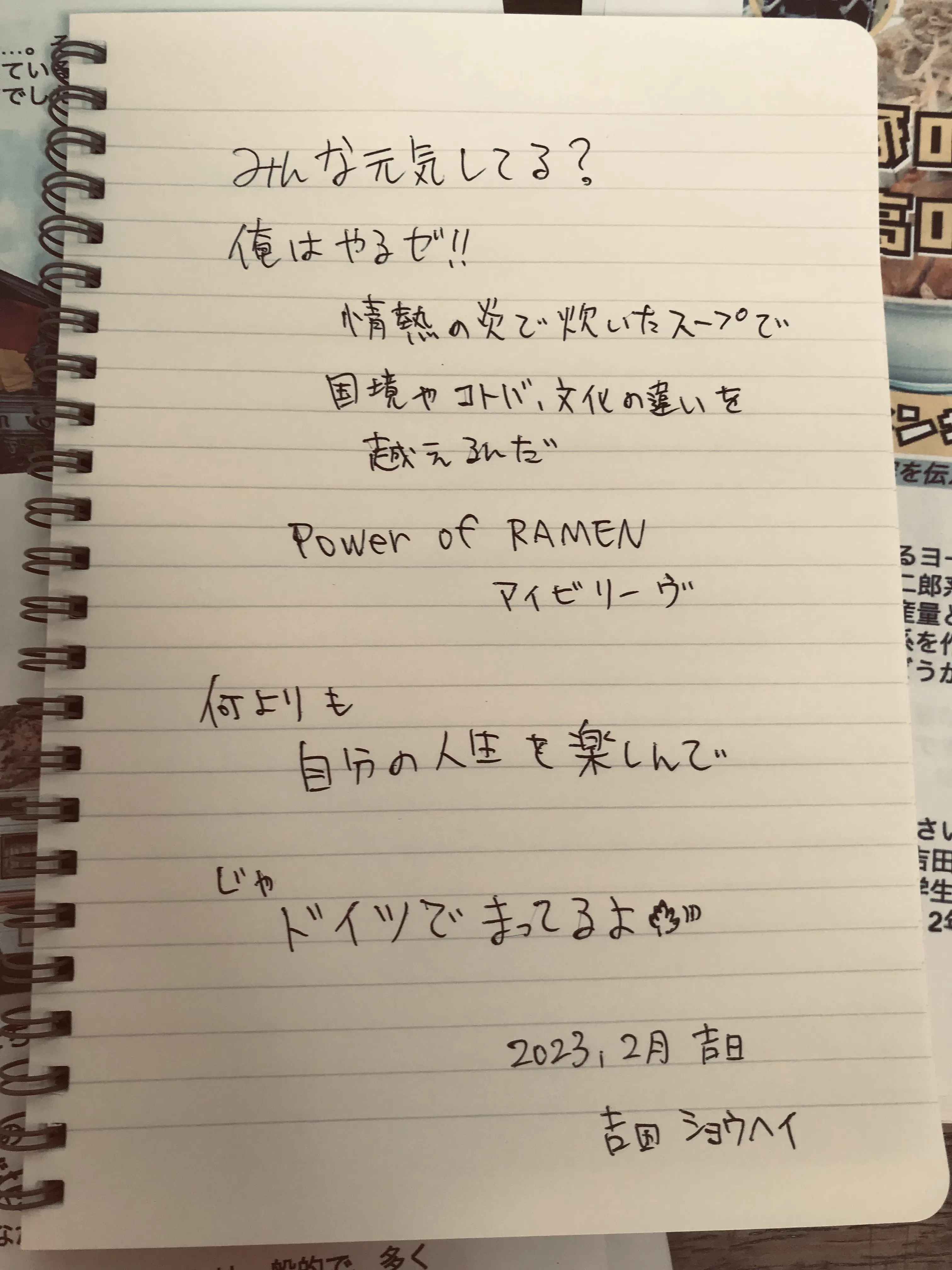 吉田ショウヘイさんとはたまに食事をしたり、日頃から仲良くさせて頂いております。数年前からドイツに出店するんだと熱く目標を語っていました。有言実行する行動力、気さくで誰とでも仲良くなれる人柄、そして美味しいラーメンでドイツの方々を魅了することでしょう。大谷ショウヘイ選手のように世界の吉田ショウヘイになると思います。是非皆で応援しましょう。