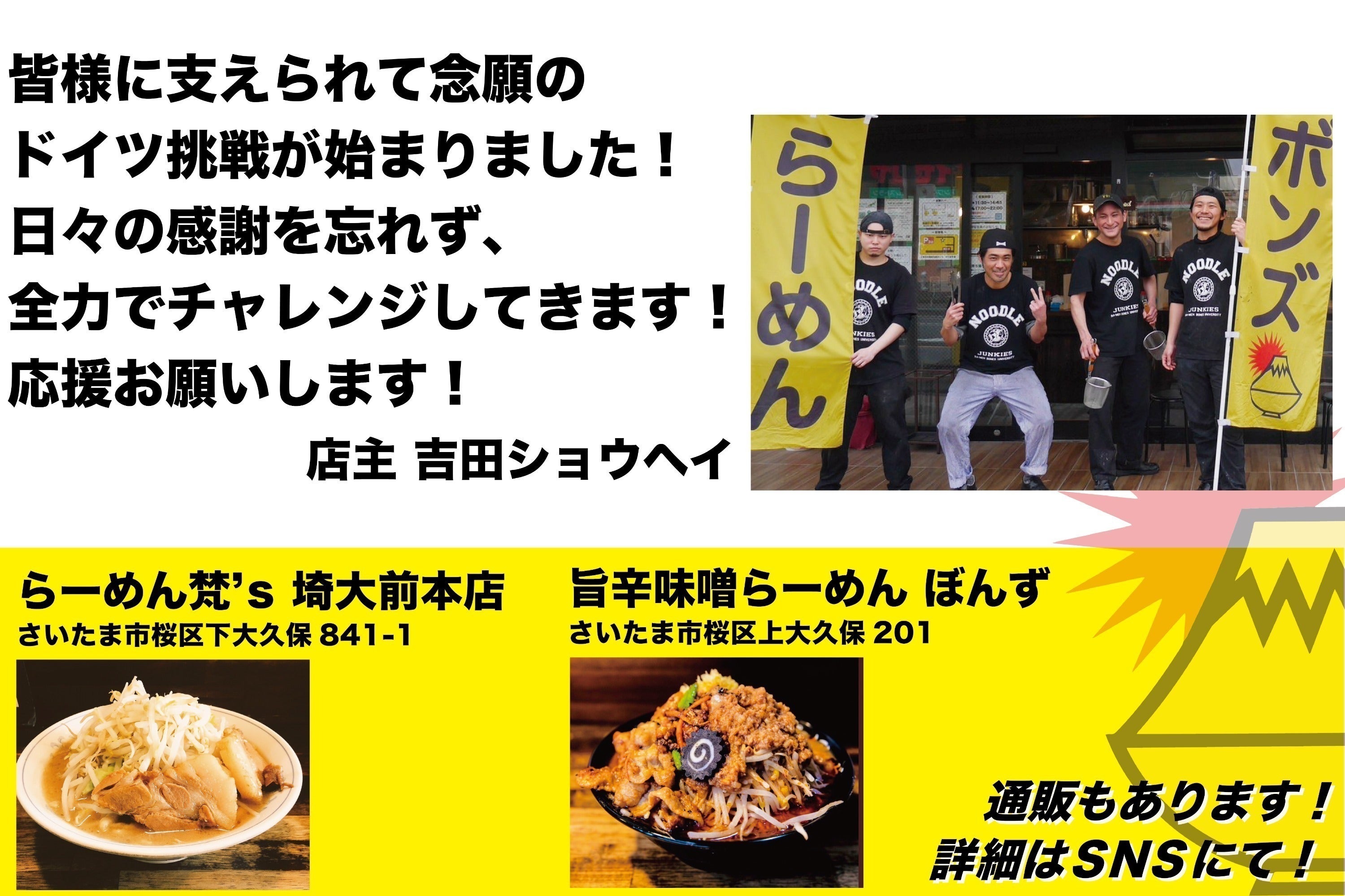 大学生の頃、毎週のように食べに行ってた僕たちのソウルフードが豚の本場、ドイツに挑戦すると聞いて大興奮してます。ドイツに住んでる友達にも、ドイツでのラーメン人気の話を聞いてますが、ジロー系がまだ無いらしいので我らがボンズがカマしてくれること間違いなしだと思ってます。ドイツでも行列をつくってくれるのを楽しみにしてます!