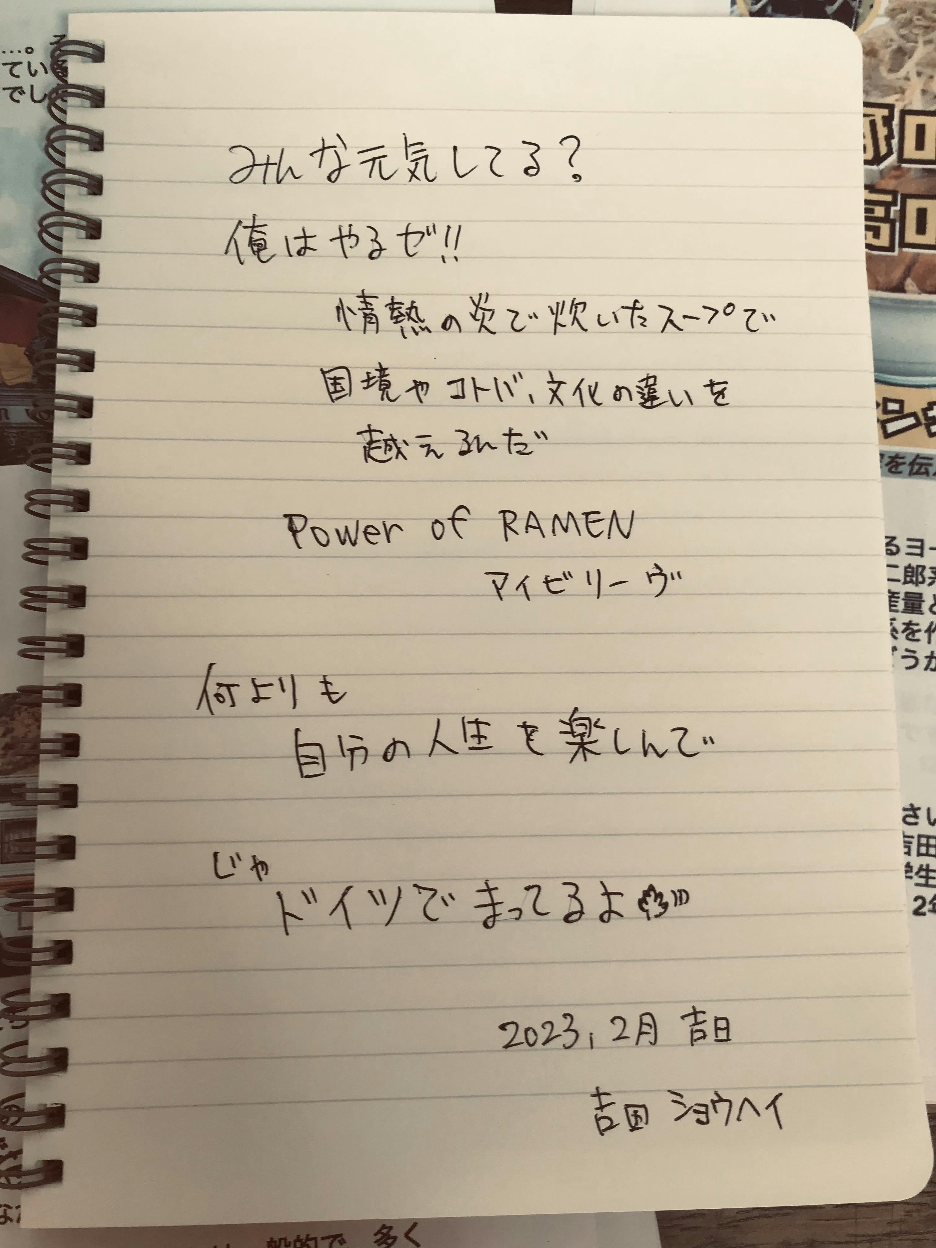 吉田ショウヘイさんとはたまに食事をしたり、日頃から仲良くさせて頂いております。数年前からドイツに出店するんだと熱く目標を語っていました。有言実行する行動力、気さくで誰とでも仲良くなれる人柄、そして美味しいラーメンでドイツの方々を魅了することでしょう。大谷ショウヘイ選手のように世界の吉田ショウヘイになると思います。是非皆で応援しましょう。