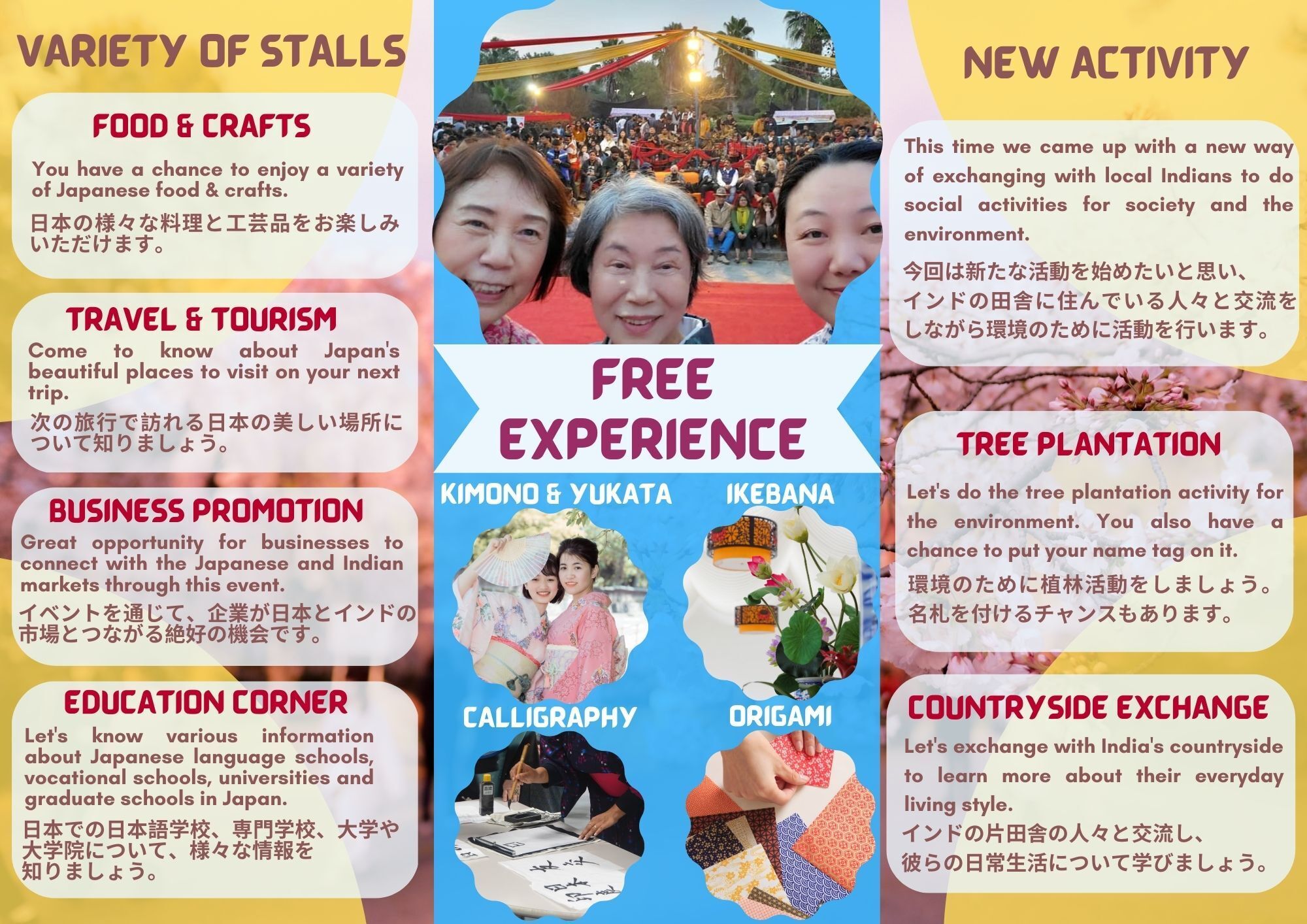 (浴衣、おにぎり、書道、茶道、折り紙、サリー、ヘナアートなど)