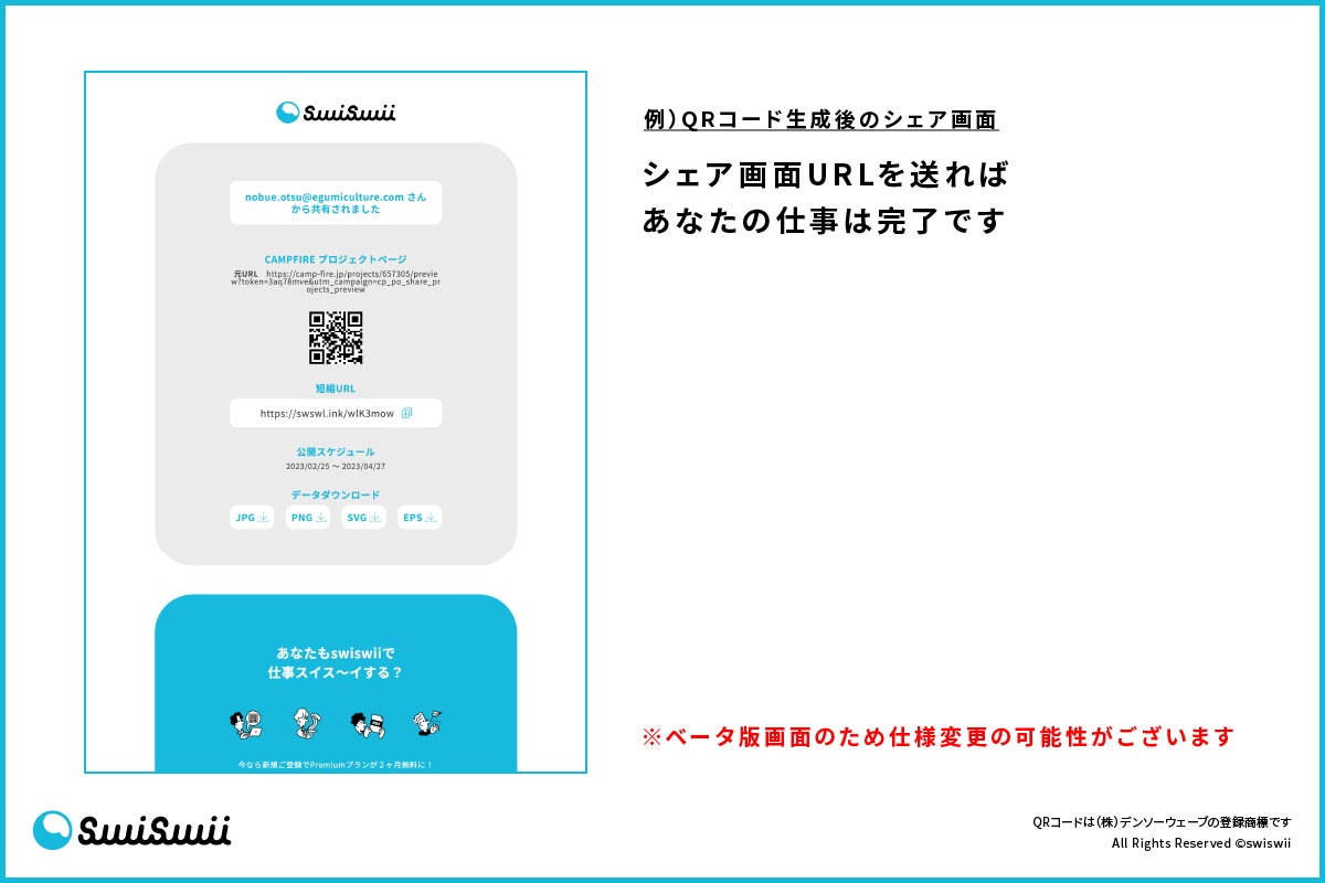QRコードを生成後に発行されるシェアURLを送れば、QRコードをダウンロードして、メールで送る手間を省くことができます。すべての機能でこのシェアURLが自動で発行されます。