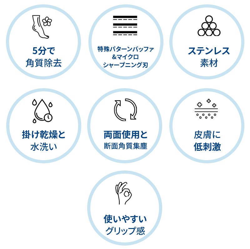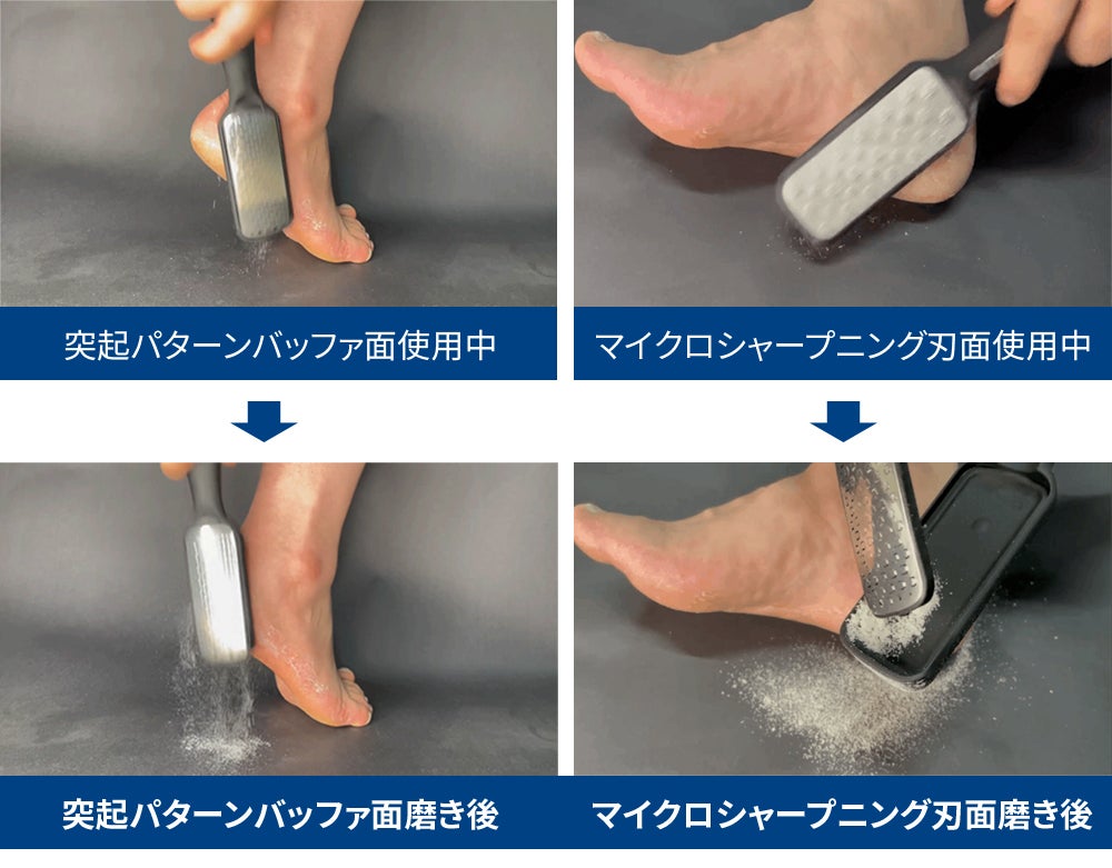 角質がひどい方はハード面(突起パターンバッファ面)で一次角質を取り除いた後、ソフト面(マイクロシャープニング刃面)でやさしく使い、仕上げにお使いください。