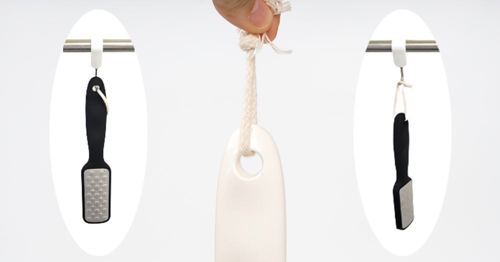 それで取っ手部分に輪のない一次製品を販売していました。1次製品を購入された方の大多数の意見がかけて乾燥できるのでより便利だという意見で、今回の「両面フットリムーバー」は輪にかけられるように穴と紐を追加しました。