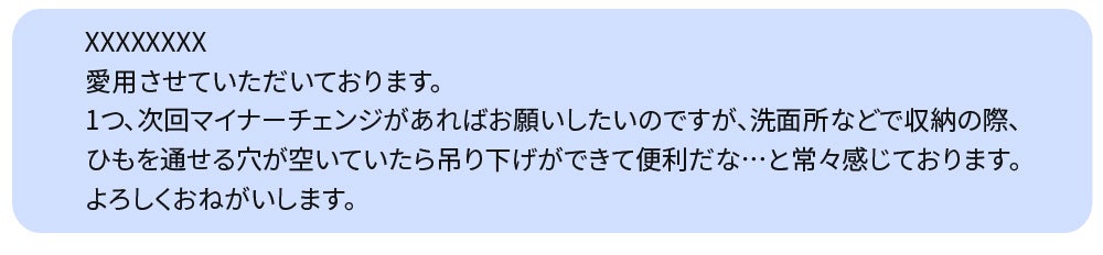 しかし、デビュー中に弊社の目に入った意見は"洗面所などで収納の際、ひもを通せる穴が空いていたら吊り下げができて便利だな…"でした。