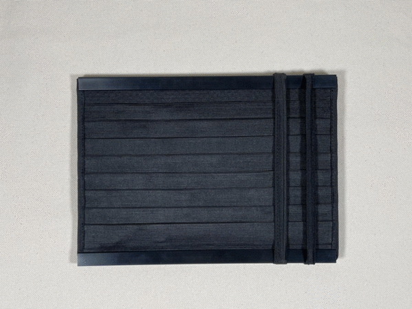 ボードに収縮バンド9枚をずらして重ね、その隙間からモノを入れて収納する構造です。