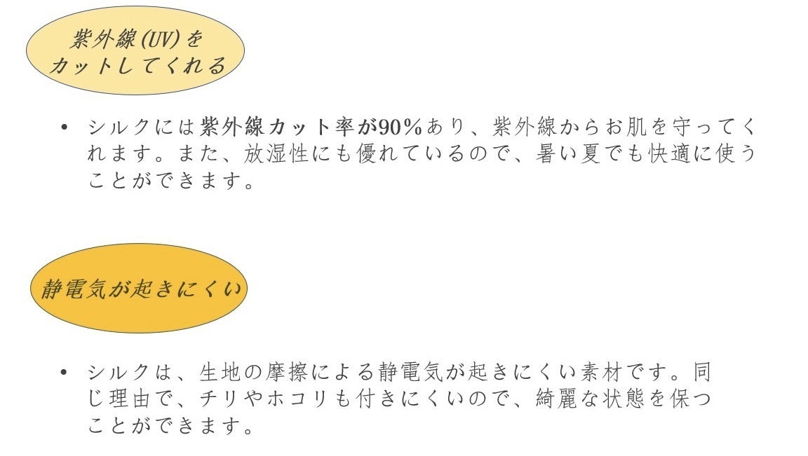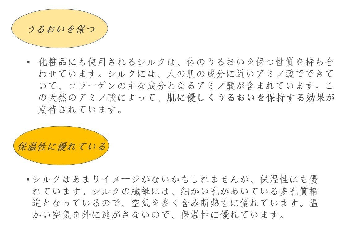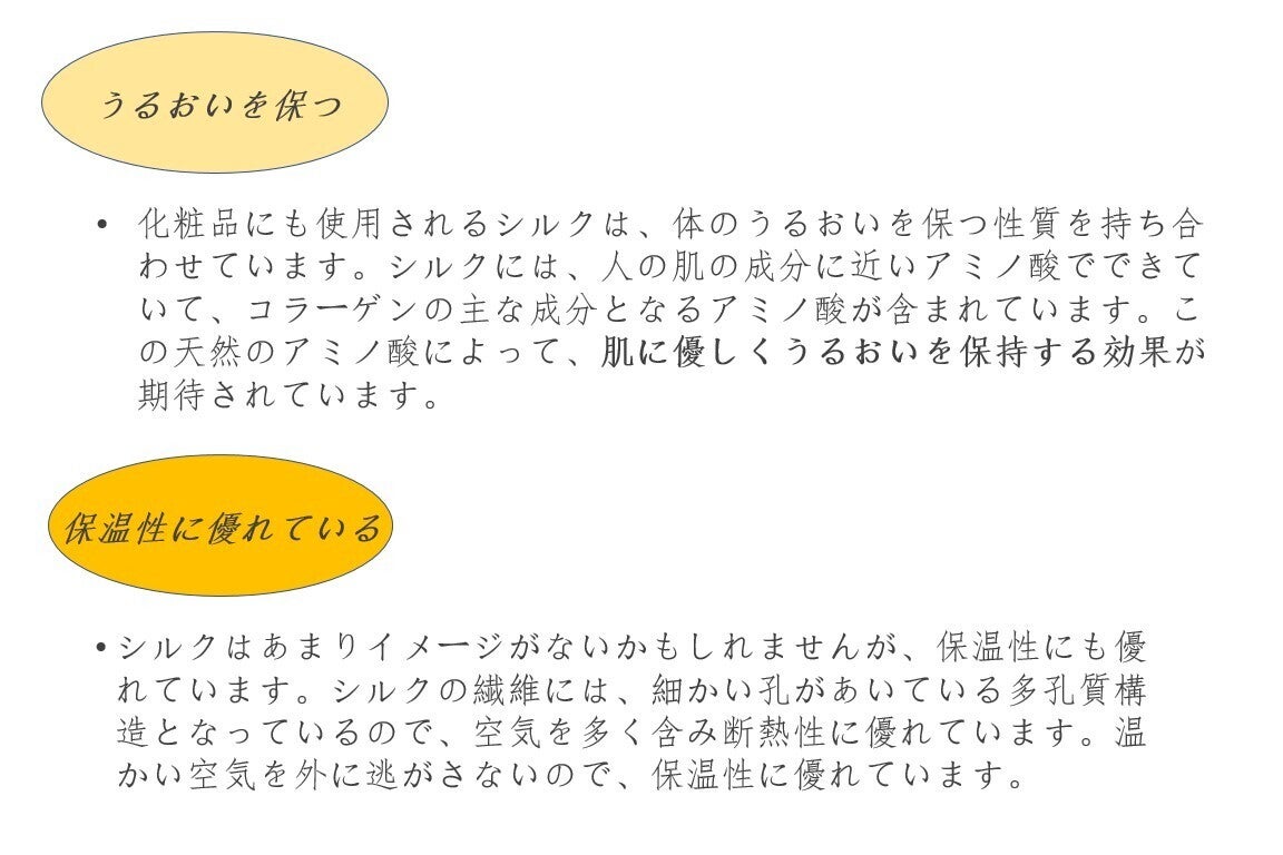 また、シルクの魅力である、吸湿性・放湿性の良さ、夏は涼しく、冬は暖かいといった性能そのままです。