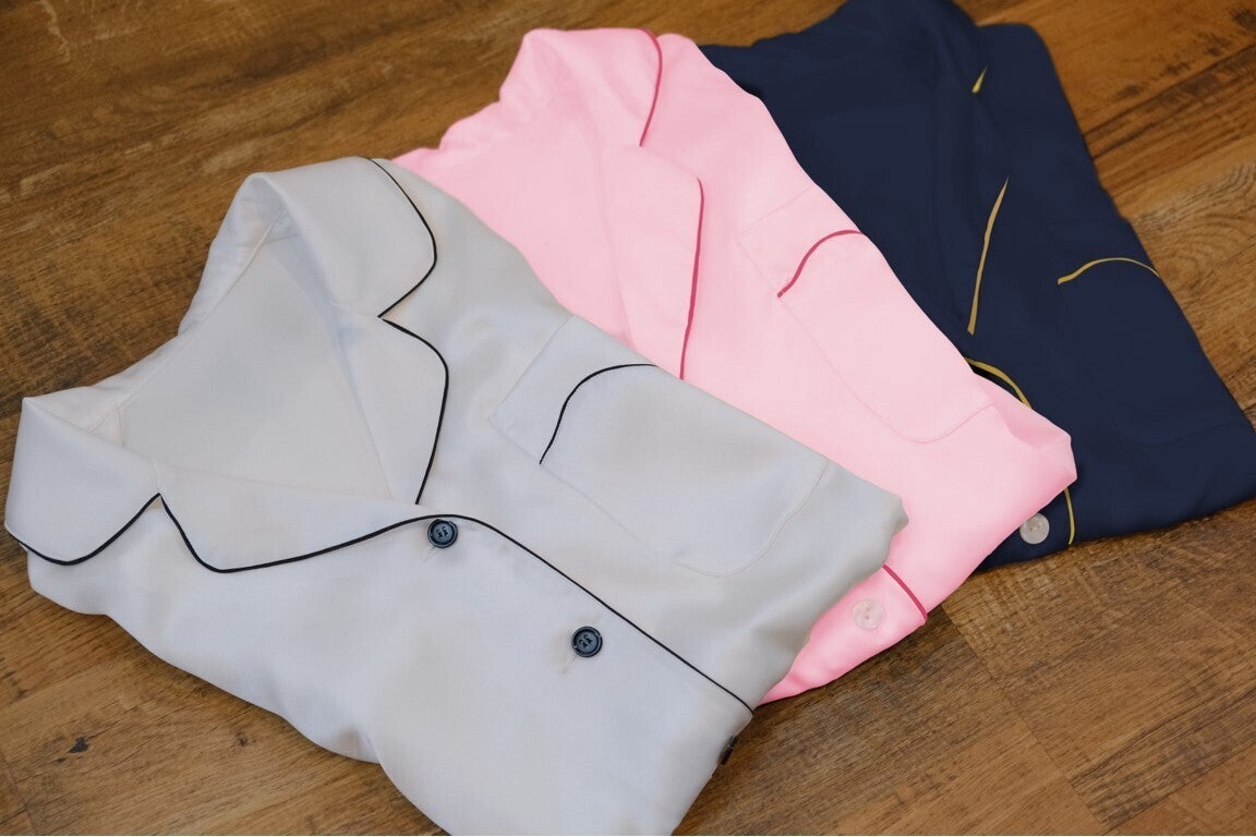 今シルク100%のシルクパジャマのほとんどが、16匁、19匁で作られているものになっています。シルクでよく聞く、「匁(もんめ)」とは重さの単位として使われており、1匁は3.75gでシルクの生地では93cm×93cmの重さになります。16匁だと非常に軽くて薄手、19匁だと軽くてやや厚みがあり、22匁だと厚みがあり、しっかりしているという印象で、匁が大きくなるほど高価になると言われています。