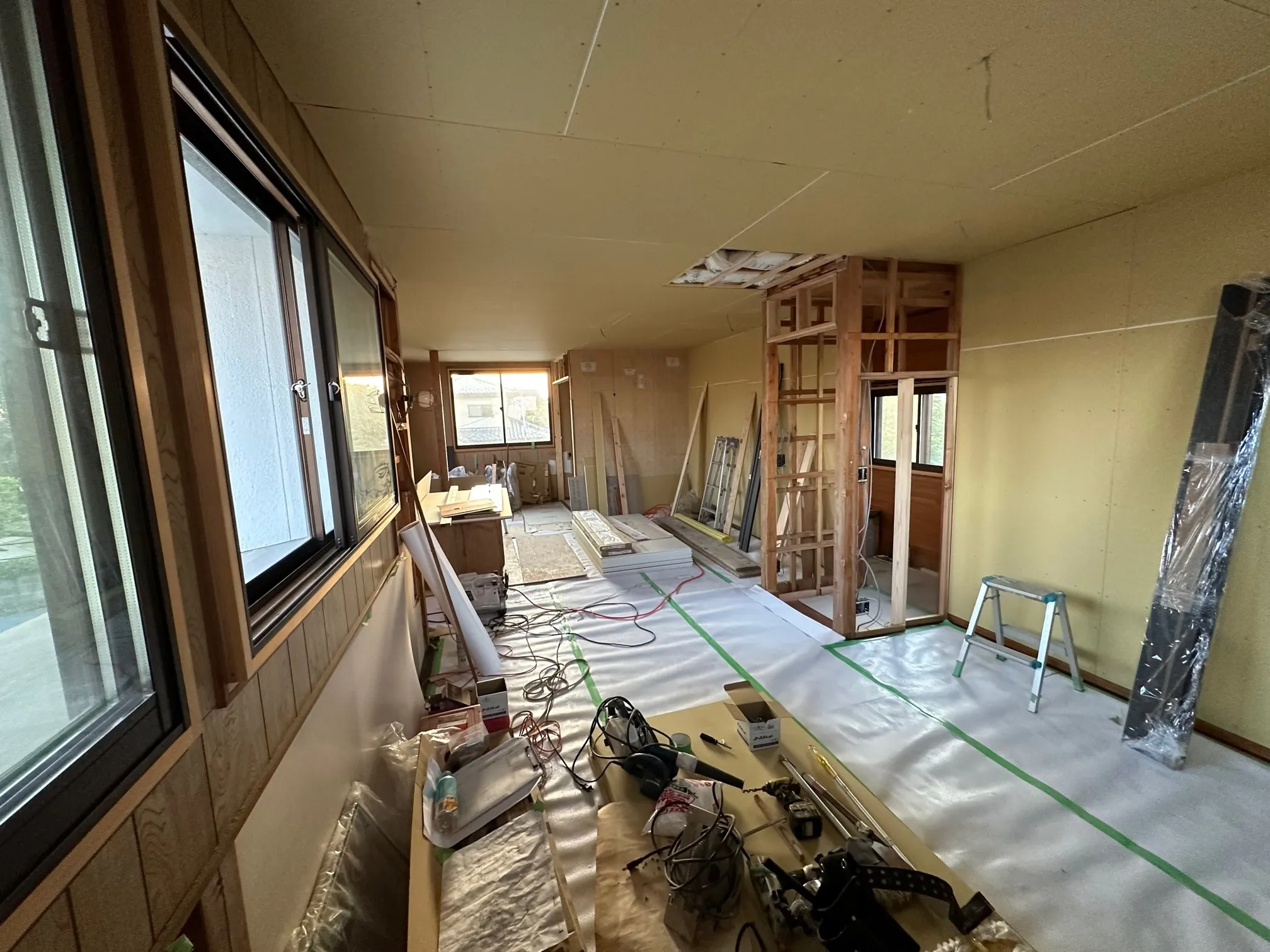 工事は順調に進んでいます、養生に隠れていますが床は張り終わり、天井や壁のボード張りが進んでいます。DIYで塗りがいのある広い面が見えてきました!
