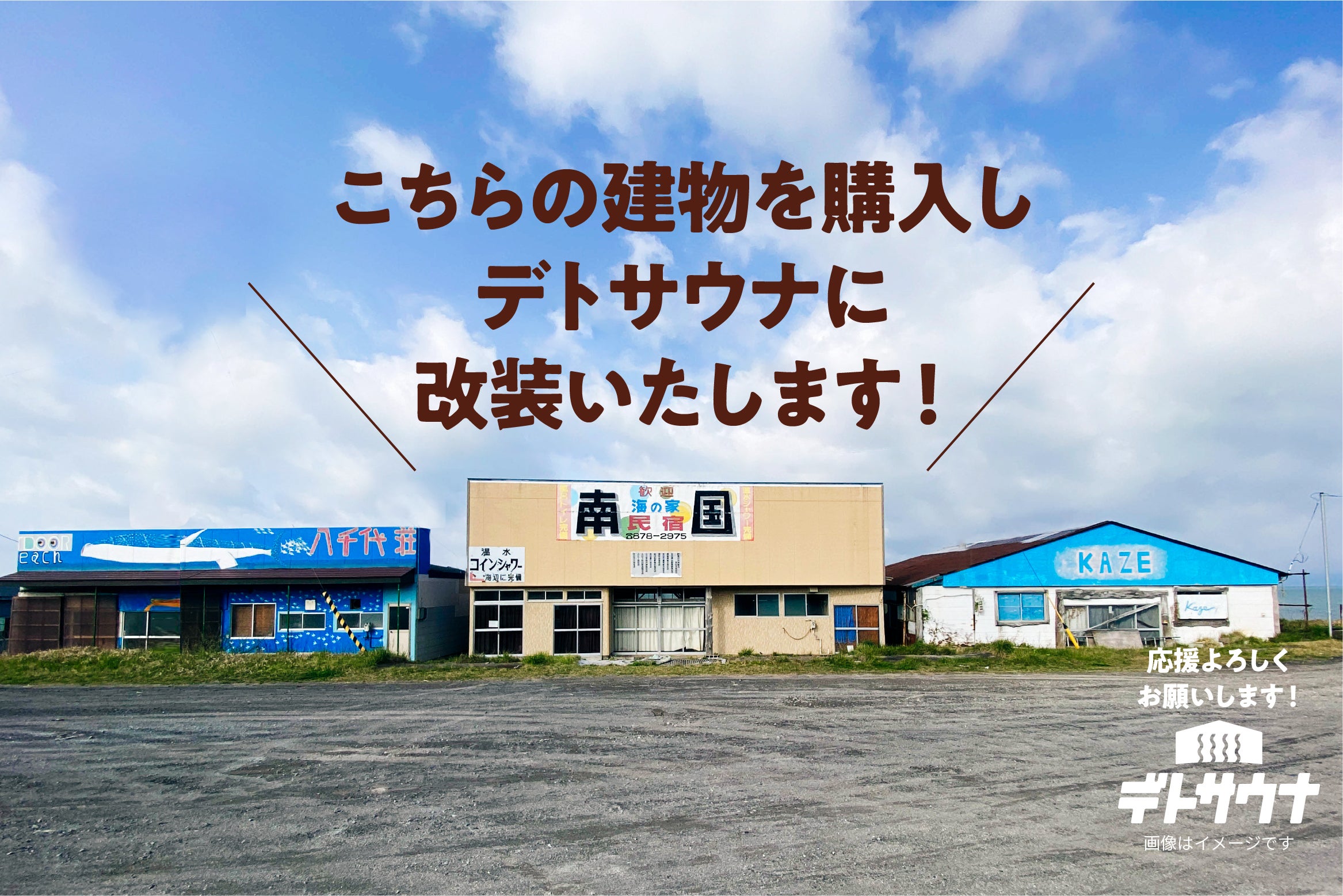 そしてこの度、皆様にご支援をお願いしたい計画は、秋田県潟上市にある出戸浜海水浴場の海の家を改装して、「デトサウナ」をオープンする資金です。私自身が50歳を過ぎ、時代の変革とコロナ禍を経験して「新たにチャレンジするならば、地域に自分が心底楽しいと思える場所を作りたい」と思いました。そういう姿を子ども達にも見せていきたいのです。