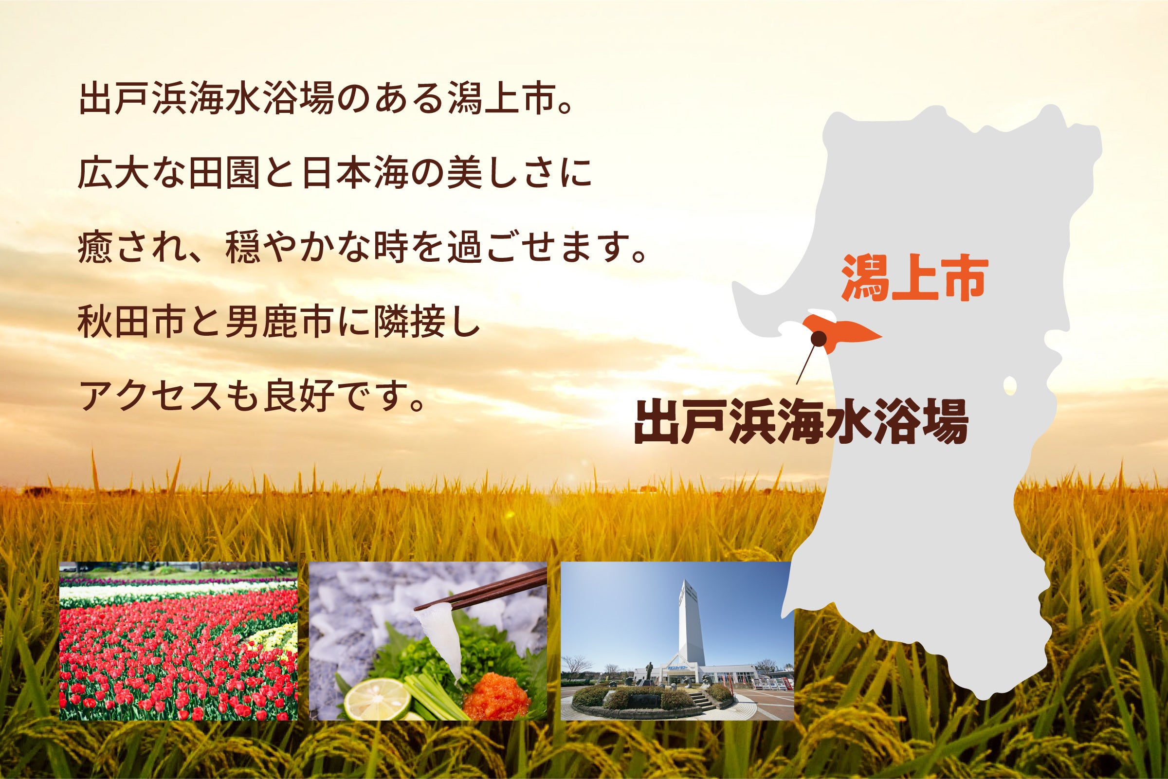 ですが潟上市にも知る人ぞ知る魅力がたくさんあります。4万本あまりのチューリップが咲く「ブルーメッセ秋田」。無料展望台がそびえる大型公園「天王グリーンランド」。また、秋田県の沿岸には日本海におけるふぐ産卵場の北限があり、潟上市でも「北限の秋田ふぐ」が水揚げされます。