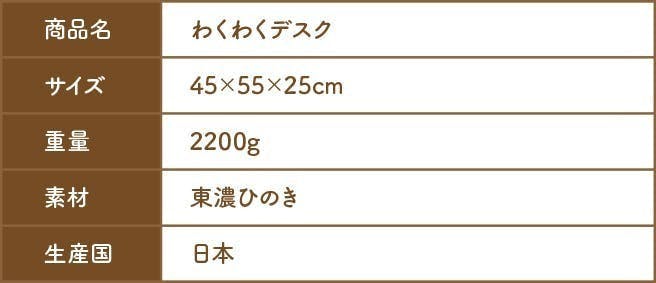 わくわくデスクの素材となる東濃ひのきは岐阜県の東部地域 裏木曽を中心に算出されるひのきで、伊勢神宮の式年遷宮では外宮の御神木として使用される抜群の信頼性を持った木です。