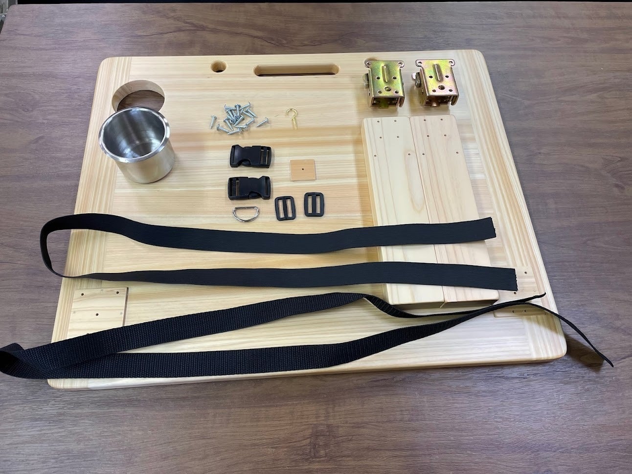 机の上にドリンクホルダーとベルト、ベルトの留め具に部品を組み立てるためのねじとベルトをひっかけるためのフック、脚と金具の部品すべてをここで組み立ててもらっています。