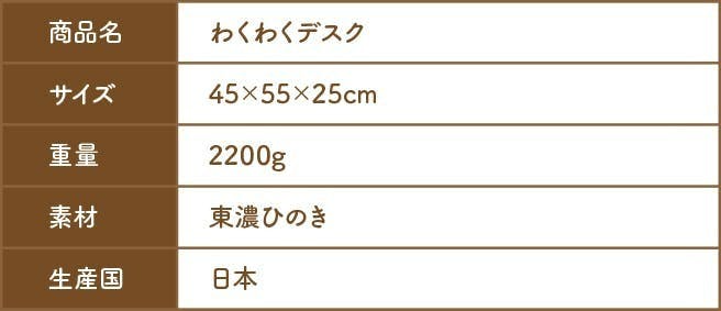 わくわくデスクの素材となる東濃ひのきは岐阜県の東部地域 裏木曽を中心に算出されるひのきで、伊勢神宮の式年遷宮では外宮の御神木として使用される抜群の信頼性を持った木です。