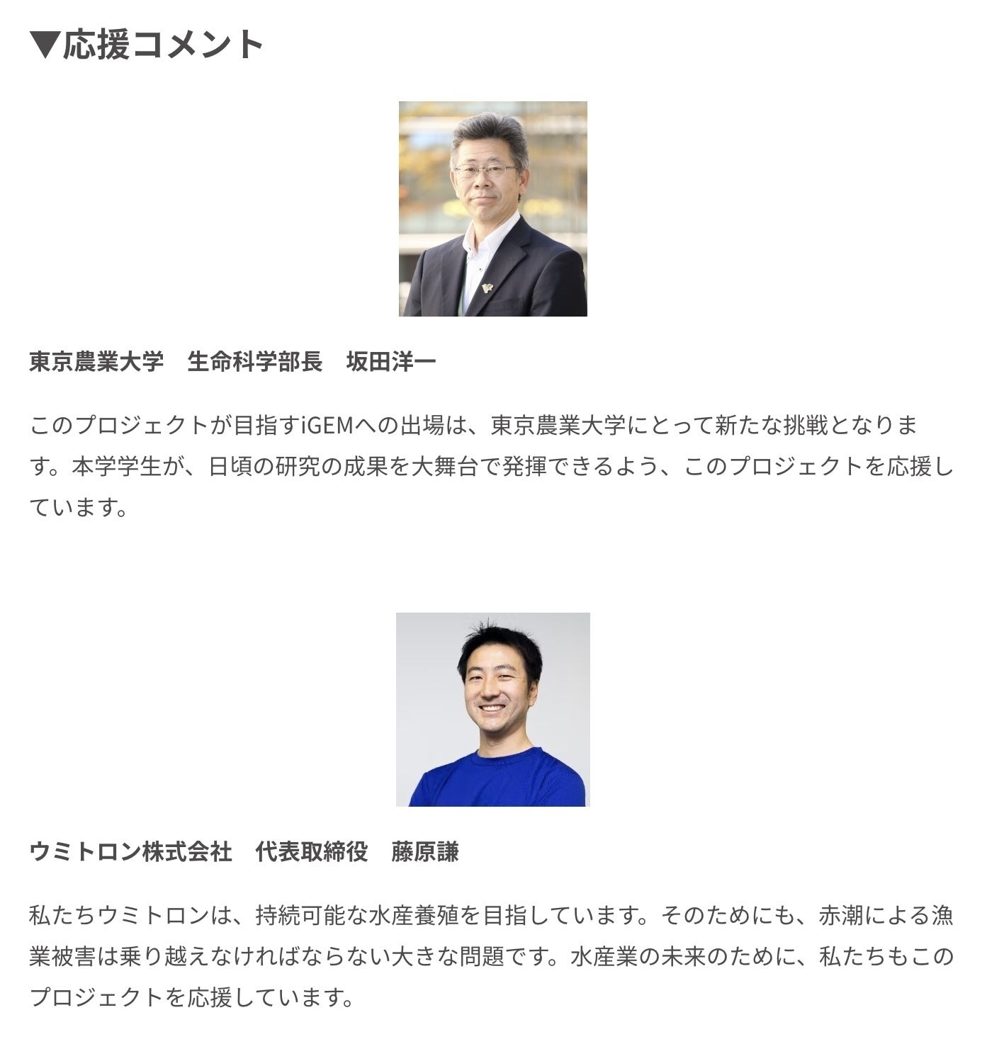 【応援メッセージ】東京農業大学生命科学部長 坂田先生、UMITRON 藤原社長より応援メッセージをいただきました!