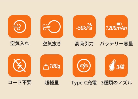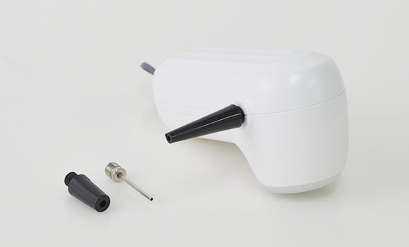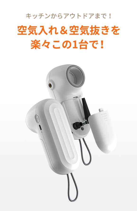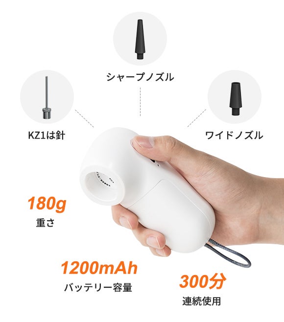 ZK1は手のひらサイズのコンパクトなボディに3種類のノズル、空気吸入口、空気注入口をまとめました。収納にも携帯にも場所を取りません。