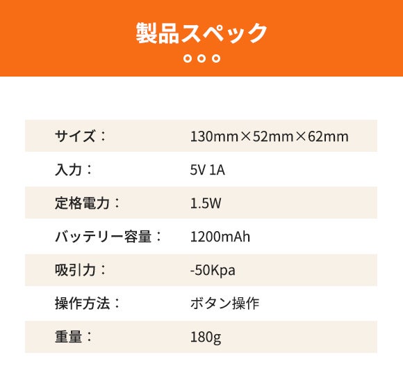 コンパクトサイズながら、容量1200mAhバッテリーを搭載しており、300分連続使用できます。重さはわずか180gで携帯しやすく、片手で扱えますので使いたい時にすぐ使える便利な1台です。