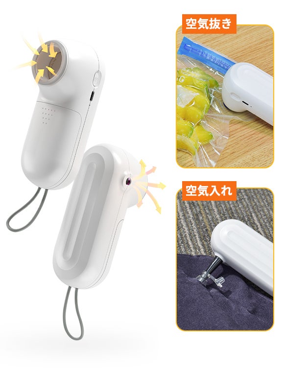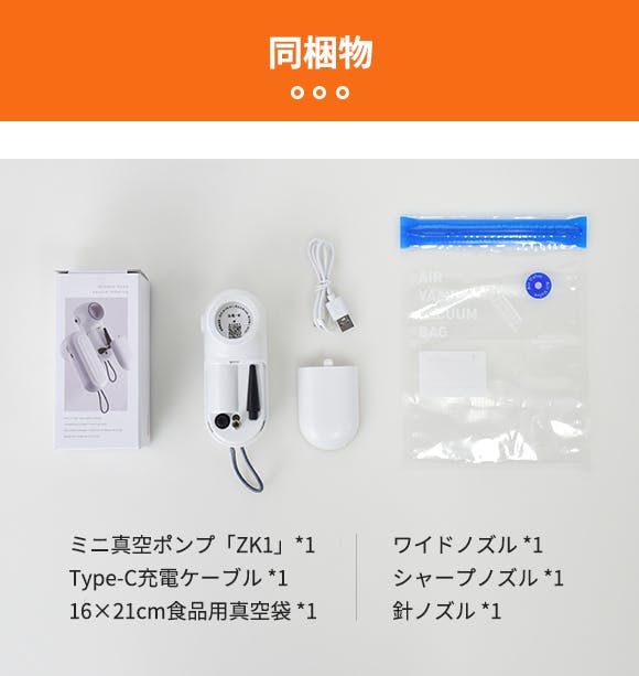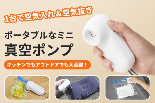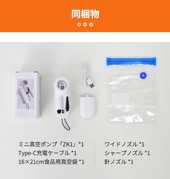 「ZK1」は空気入れと空気抜きができるポータブルなミニ真空ポンプです。真空容器や圧縮袋で食品や衣類などを保存する時に役立ちます。本体に3種類のノズルを内蔵しており、様々な製品に対応可能です。