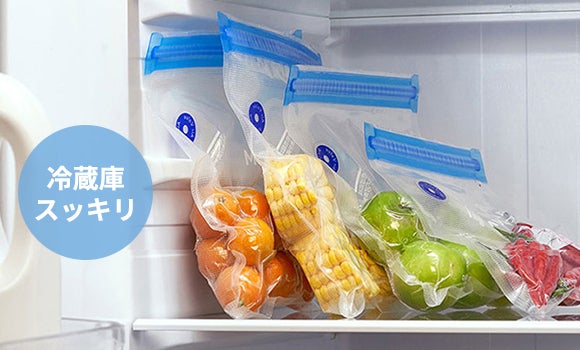 肉や魚、野菜などを買いだめした時、真空袋や真空容器を利用して保存すると、鮮度をより長く保つことができます。ZK1を使えば、面倒な空気抜きもあっという間に完了です。