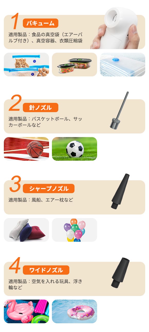 KZ1は針、シャープ、ワイドの3種類のノズルが付属しています。製品に合ったノズルを選んで、簡単に空気入れと空気抜きができます。