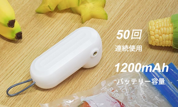 1200mAhの大容量バッテリーを内蔵しており、真空袋の空気抜きなら約50回使用できます。キャンプやバーベキューで残った食材なども真空保存して、無駄にしません。