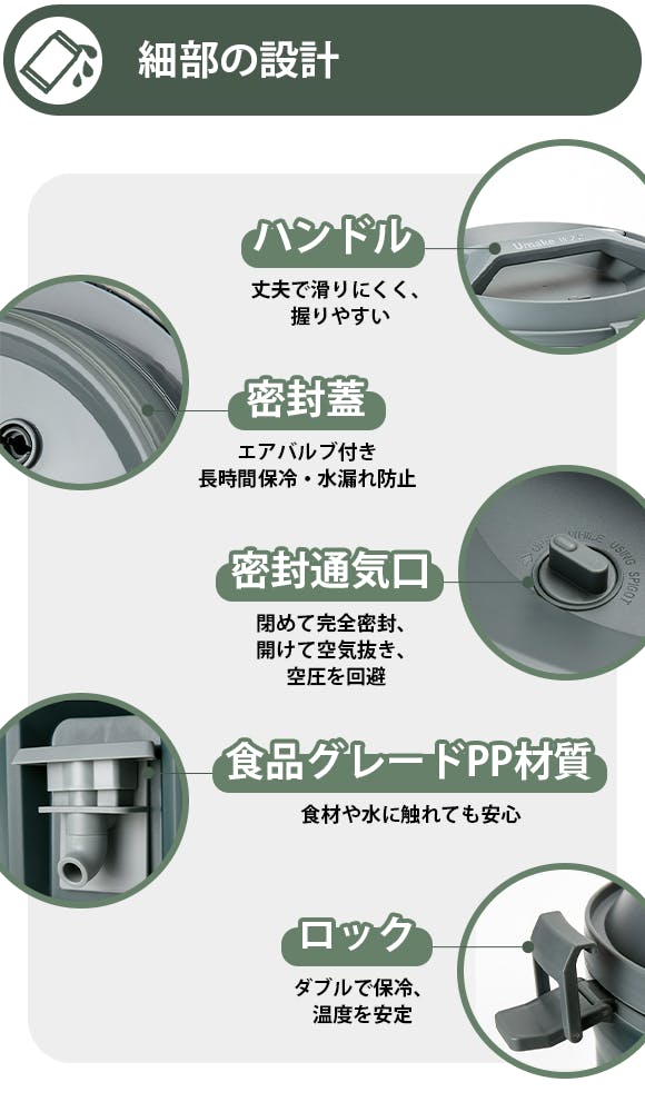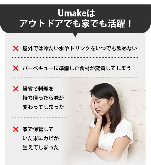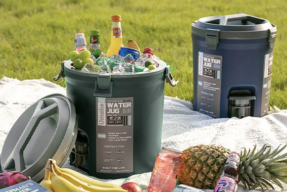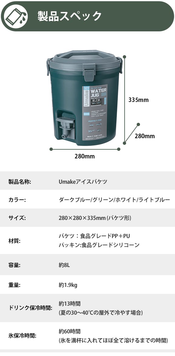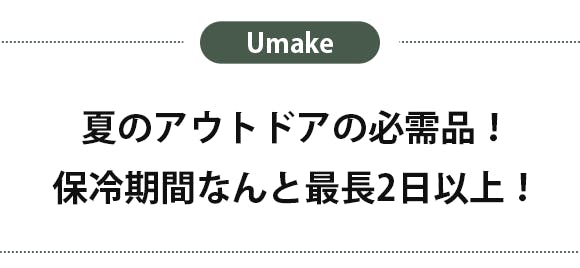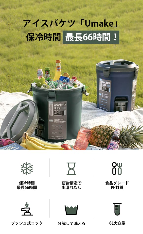 楽しいレジャーが待っている夏はもうすぐ!「Umake」はウォータージャグとしてもクーラーボックスとしても使用できる、ポータブルな大容量アイスバケツです。保冷時間は従来のクーラーの4倍!アウトドアでも食材を新鮮にキープし、キンキンに冷えた水を飲むことができます。この夏はUmakeと一緒に海へ山へ出かけましょう!