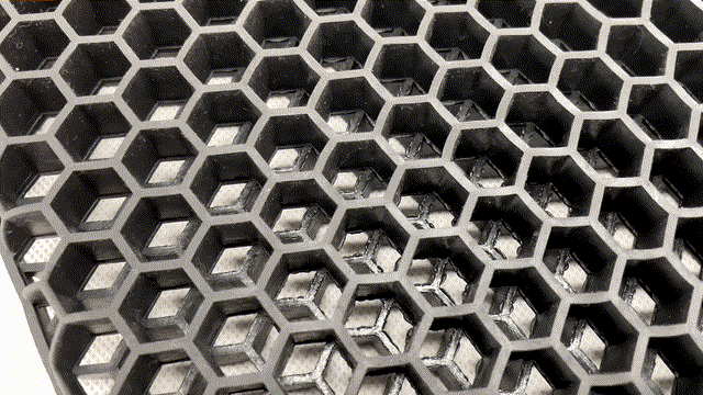 ハニカム構造は軽くて強度があり、また音や衝撃を吸収できて断熱効果もある理由から、現在では飛行機の翼や新幹線、建造物などの構造材料をしても幅広く利用されています。立体的ハニカム構造を2重にずらすことで、1構造よりさらなる体圧分散力が増してます。