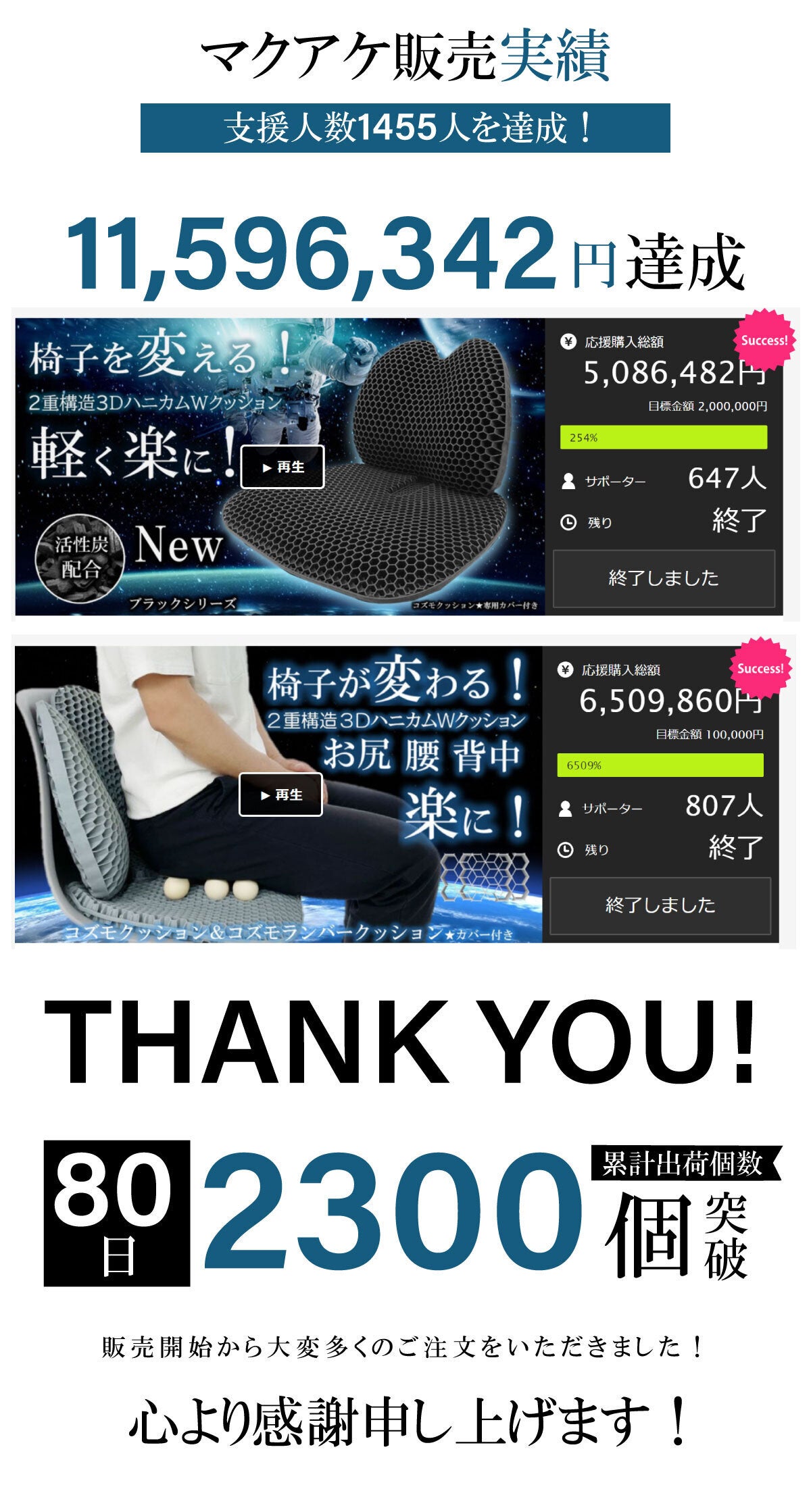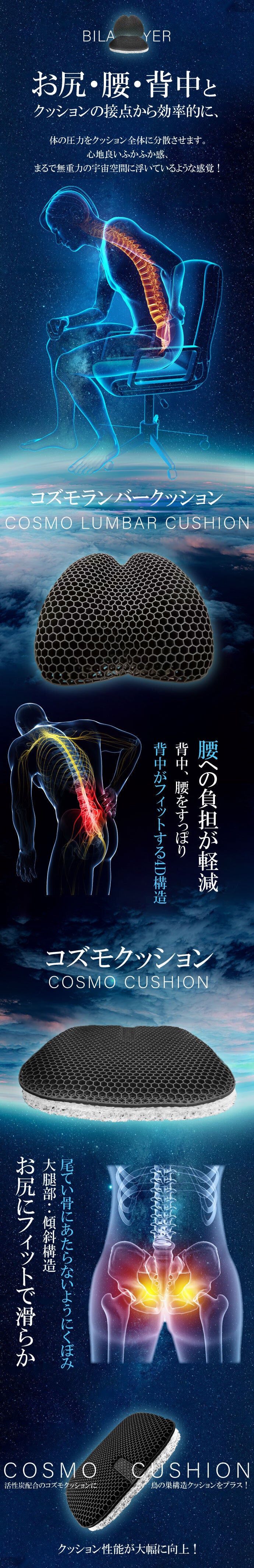 2018年より服飾雑貨、美容健康商品を自社製品開発・生産をしています。日常生活上である悩み、問題にフォーカスし便利、役立つ、サポートするをコンセプトにプロロジェクトを組んでます。今回は【座る】に着目、実際に弊社スタッフが感じている悩み、問題がどこなのか探り全力サポート出来るクッション企画をスタート。お尻、腰、背中の3つをサポートするには2つのクッションが必要。くっついていたら自由がきかない、人それぞれの位置でサポート出来るようセパレートしました。是非コズモ(宇宙)クッション+4Dエアークッション、コズモランバークッションを体感してみて下さい!椅子ライフが変わります!