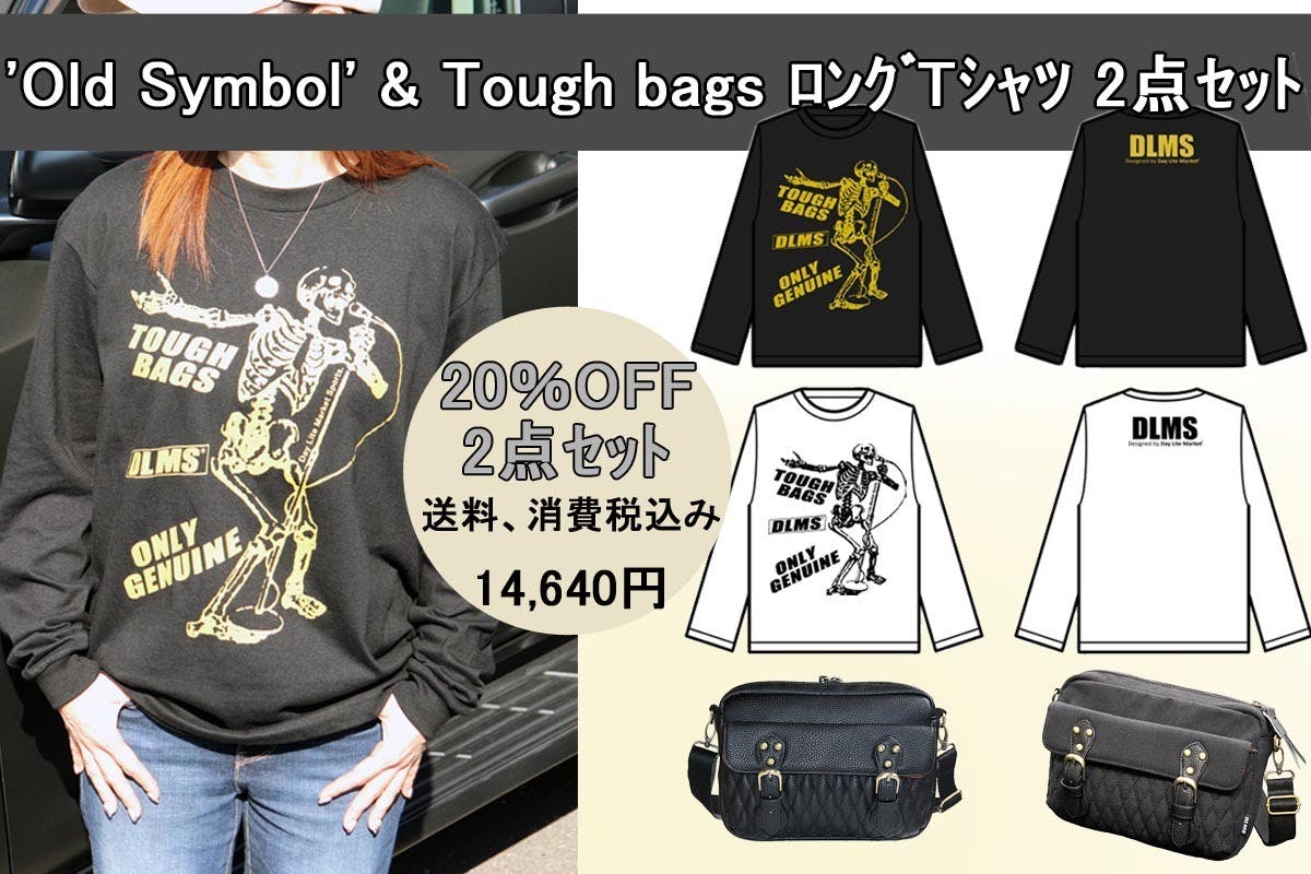 ■ 'Old Symbol' ヴィーガンレザーまたはキャンバスを1点と、Tough bags TシャツまたはロングTシャツまたはスウェットパーカーのどちらかを選んで1点、そしてDLMS公式オンラインストアで使用できる20,000円クーポン付きで30,000円にて御提供させていただきます