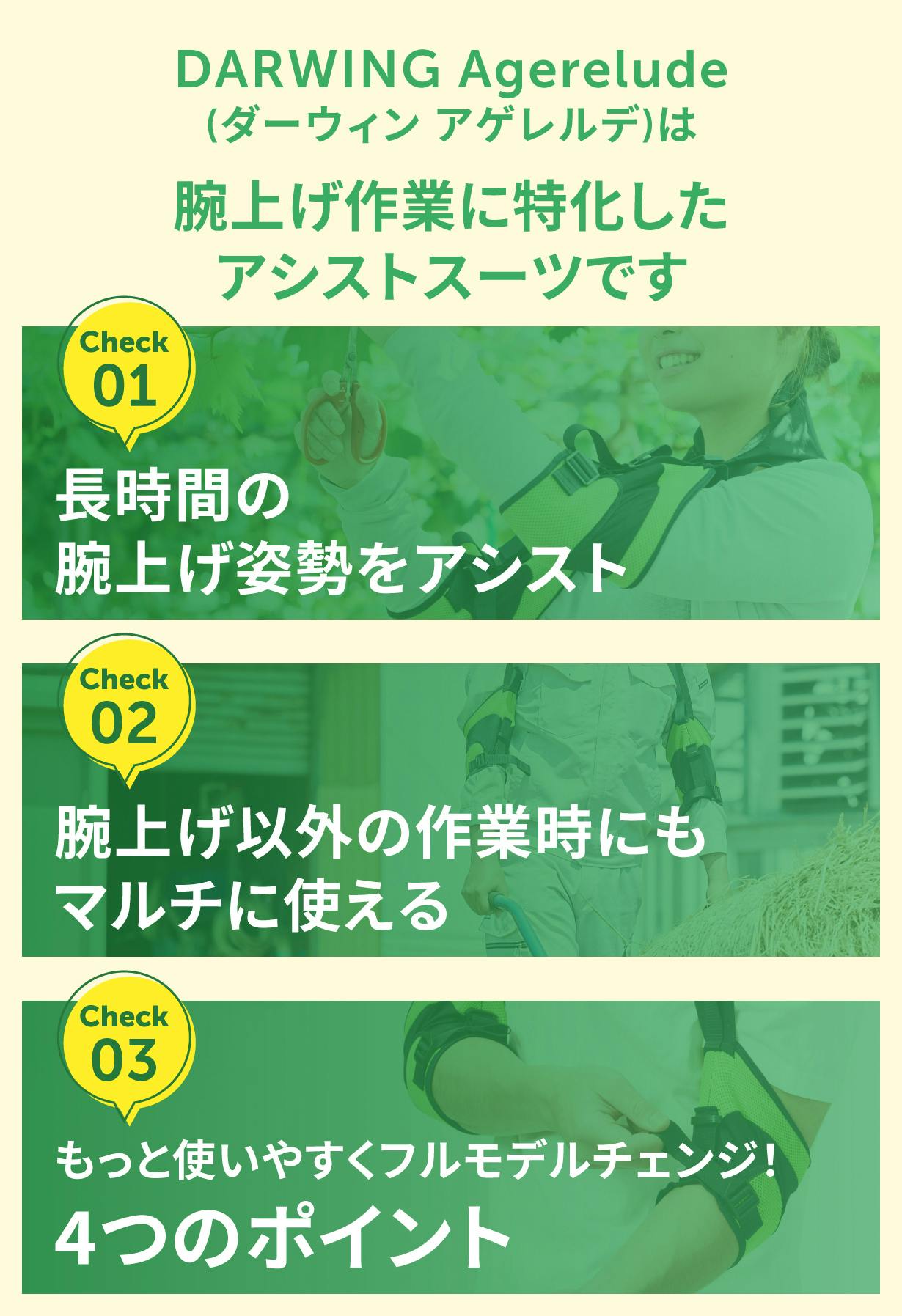 桃やぶどうの栽培では⻑時間にわたって両腕を上げる作業が多く、腕はもちろん、首、腰に負担がかかりトラブルに繋がるといったつらいお悩みを聞いてきました。その果樹農家の悩みの種である、摘粒→袋掛け→収穫時の作業負担の軽減を行うことを目的に開発したアシストスーツです。発売から約4年 経過し、ユーザーのみな様から改良のご要望をいただくことが増えたので機能はそのままに、ご要望を取り入れ、より使いやすく「DARWING Agerelude(ダーウィン アゲレルデ)」としてリリースさせていただきました。
