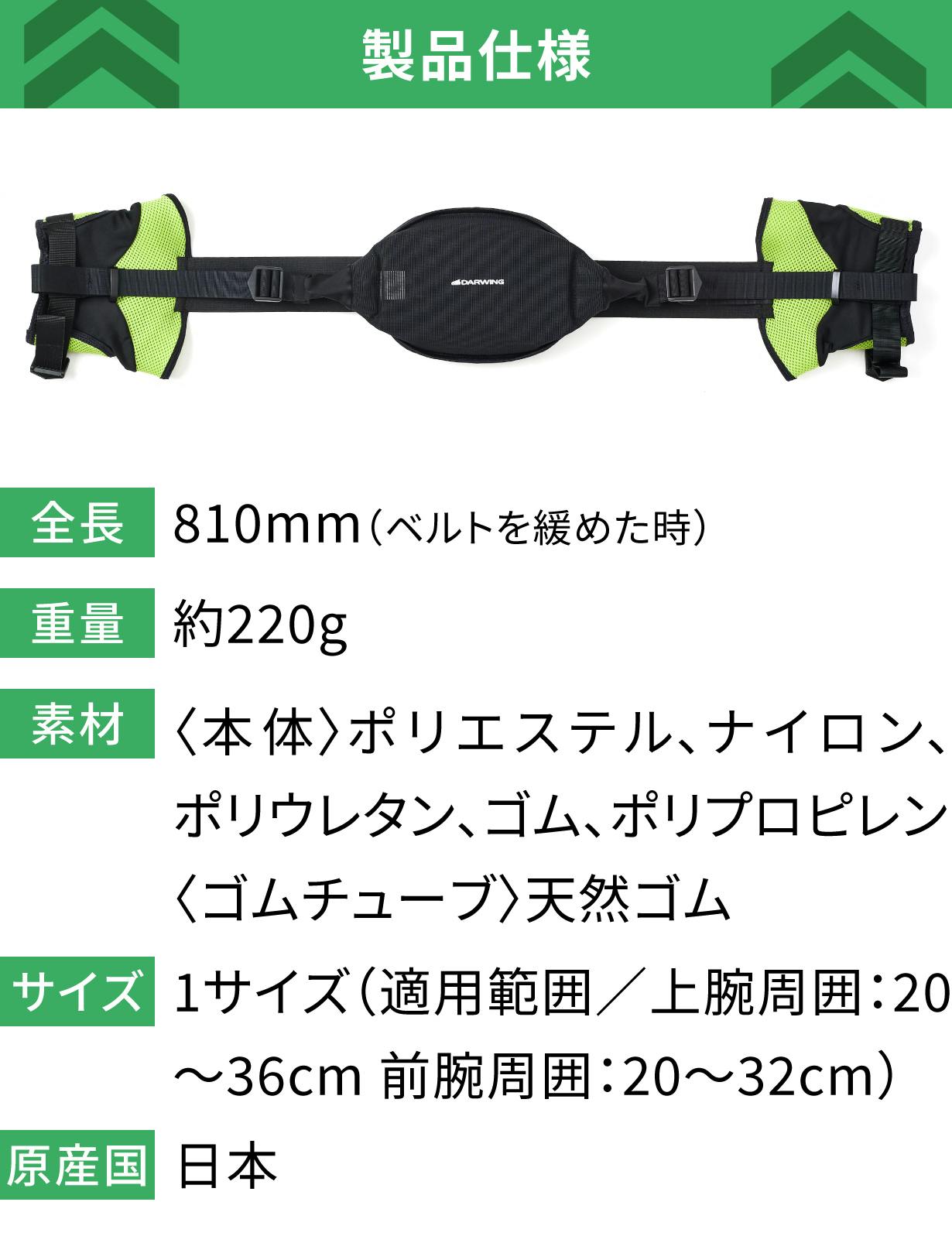 サポート力 強:調節ベルトを最大限引っ張ることでサポート力を強めることができます。腕の重さと頭の重さを拮抗させることでバランスをとり長時間の腕上げ姿勢をサポートします。 サポート力を強めることで腕が持ち上がり、腕上げが続く姿勢をアシストします。