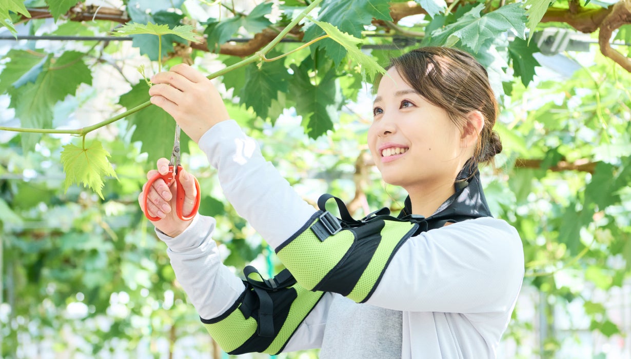 もちろんDARWING Agereludeも同様です。地元岡山県の岡山県立興陽高等学校の農業科の学生の方々にご協力をいただき、実際に当社の研究施設内にぶどうの収穫作業を再現できる器材をセットし動作解析や筋電計測にてエビデンスを取得し、製品開発を行いました。