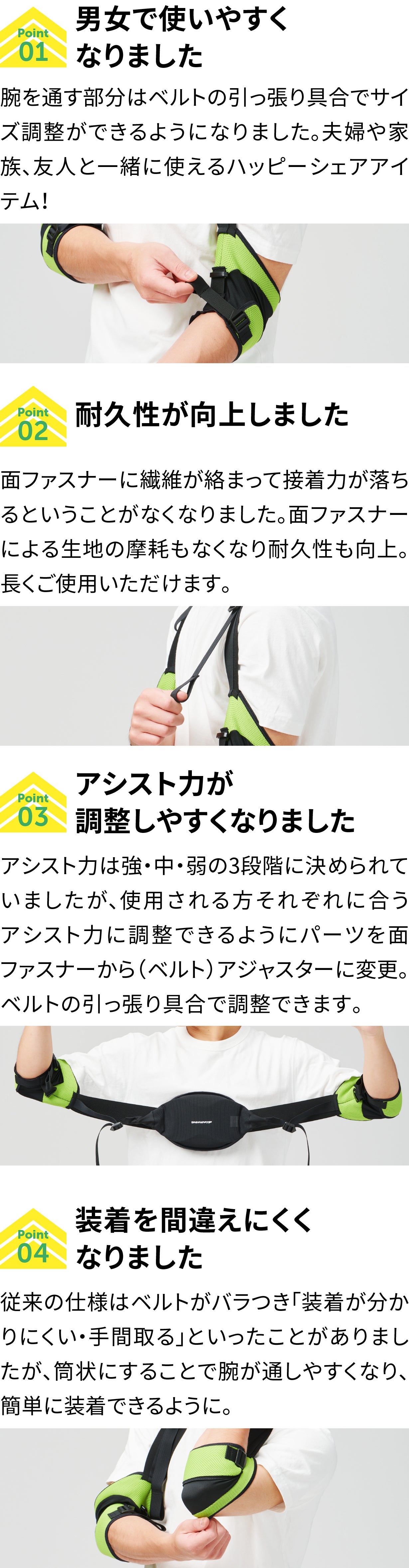 サポート力 中:調節ベルトを肘付近まで引っ張ることで中程度のサポート力を発揮します。胸の高さから頭の上の高さの範囲での繰り返し作業におすすめです。ゴムが伸びる力を活かして腕上げを楽にします。