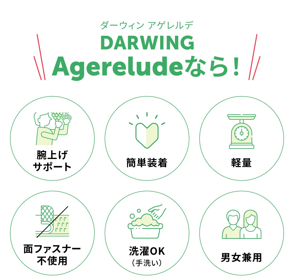 DARWING Agerelude(ダーウィン アゲレルデ)は腕上げ姿勢をアシストするアシストスーツです。軽量・柔軟で性別問わずご使用いただけます。汗をかいたり、作業時に汚れても洗濯(手洗い)ができるので、清潔な状態を維持することができます。
