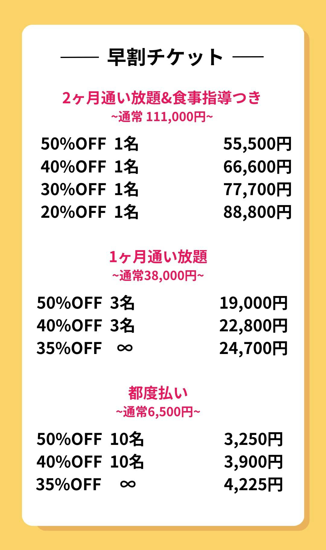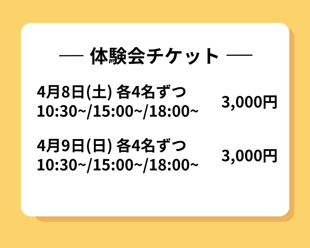 体験会の4月8日、9日は空いてなかったけど、とりあえず都度払いでいつかいきたいという方はこちらがおすすめです!