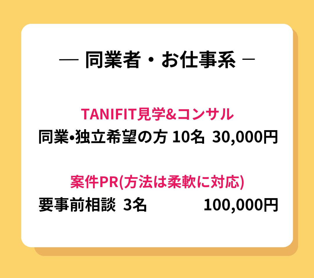 提供内容は、実際のTANIFITの1セッション見学と、カフェかzoomでTANIFITのノウハウについてのお話です!