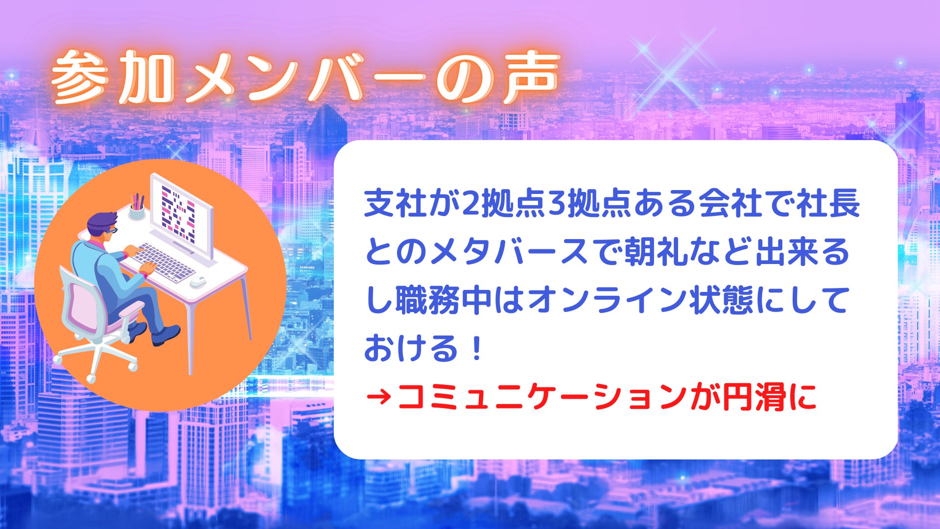 「Web3.0時代に入って新しいテクノロジーはどんどん出てきているけど、メタバースに慣れていて活用できている人もまだまだ少ない。もっと、こういった環境を知ってもらいたいし、活用してもらいたい!もっとみんなでわくわく働けるようにしていきたい!」