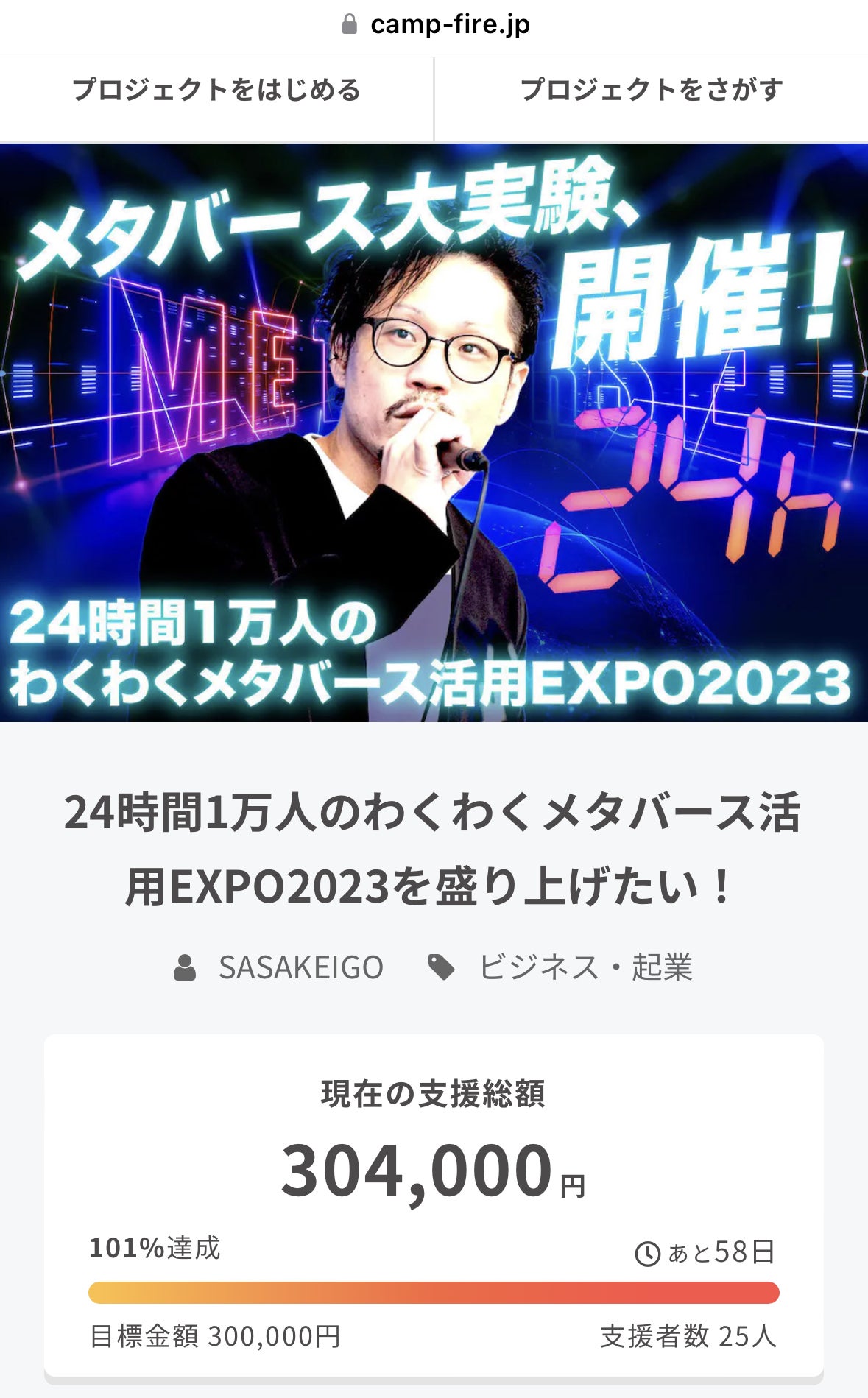 皆さん、クラファン期間中のご支援誠にありがとうございました。おかげさまで、66名の方から70万円(240%)を超える支援額を達成することができました。この勢いをそのまま、それ以上にして、5月17日18日の1万人のわくわく24時間メタバース活用EXPOを盛り上げて参ります。引き続き、どうぞよろしくお願いいたします‼︎