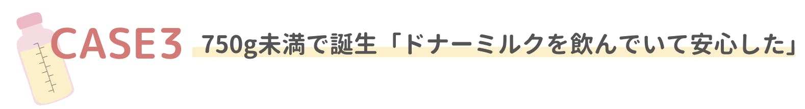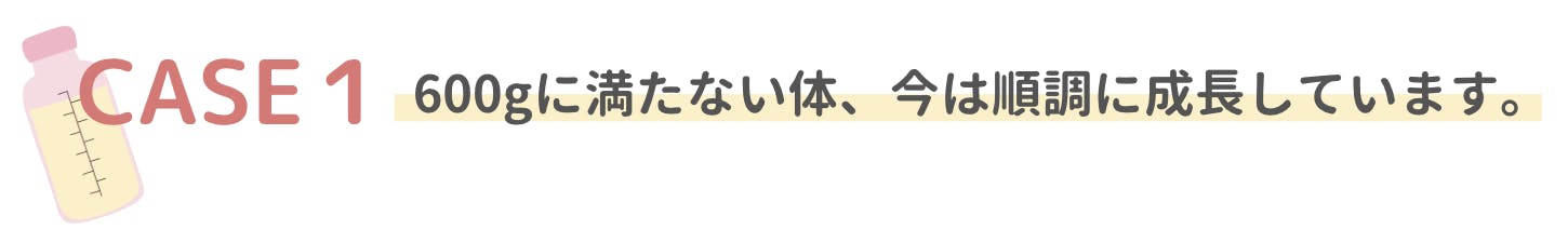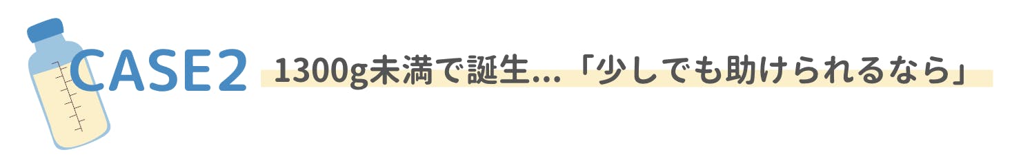 検診時に赤ちゃんの心拍の異常が見つかり、紹介先の病院でそのまま緊急帝王切開に。病院で受け取ったパンフレットでドナーミルクについて理解を深められ、お母様の身体で母乳が出る準備が整うまでの間「ドナーミルクで赤ちゃんの免疫を補うことが出来れば」との思いで、ドナーミルクをご使用になりました。ご自身の母乳ではないものの、小さく生まれた赤ちゃんがドナーミルクを飲んでいる姿を見た時には、とても安心されたとのお声を頂いています。