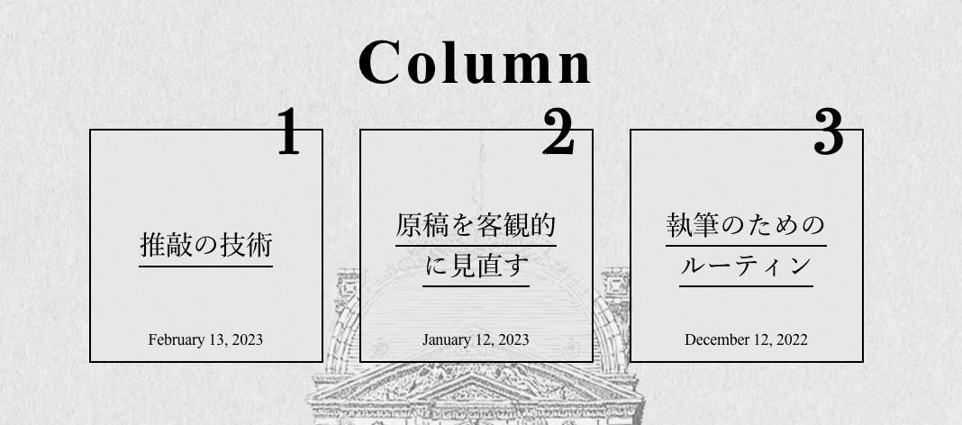 私は “BUNGAKUGAI” のライターのひとりとして、⽂学作品の執筆に役⽴つさまざまな 情報を⽇々紹介しています。扱うテーマは、レトリックや技法、⽂学⽤語など。どれも基本 的な知識ですが、それらはいつか書き⼿の武器となり、作品をより豊かで味わい深いものに してくれるはずです。このサイトを通して、皆様のなかに眠っている思いを形にするお⼿伝いができれば幸いです。今後もスタッフ⼀同でさらに充実したサイトを作り上げてまいりますので、どうぞご⽀援のほどよろしくお願いいたします。