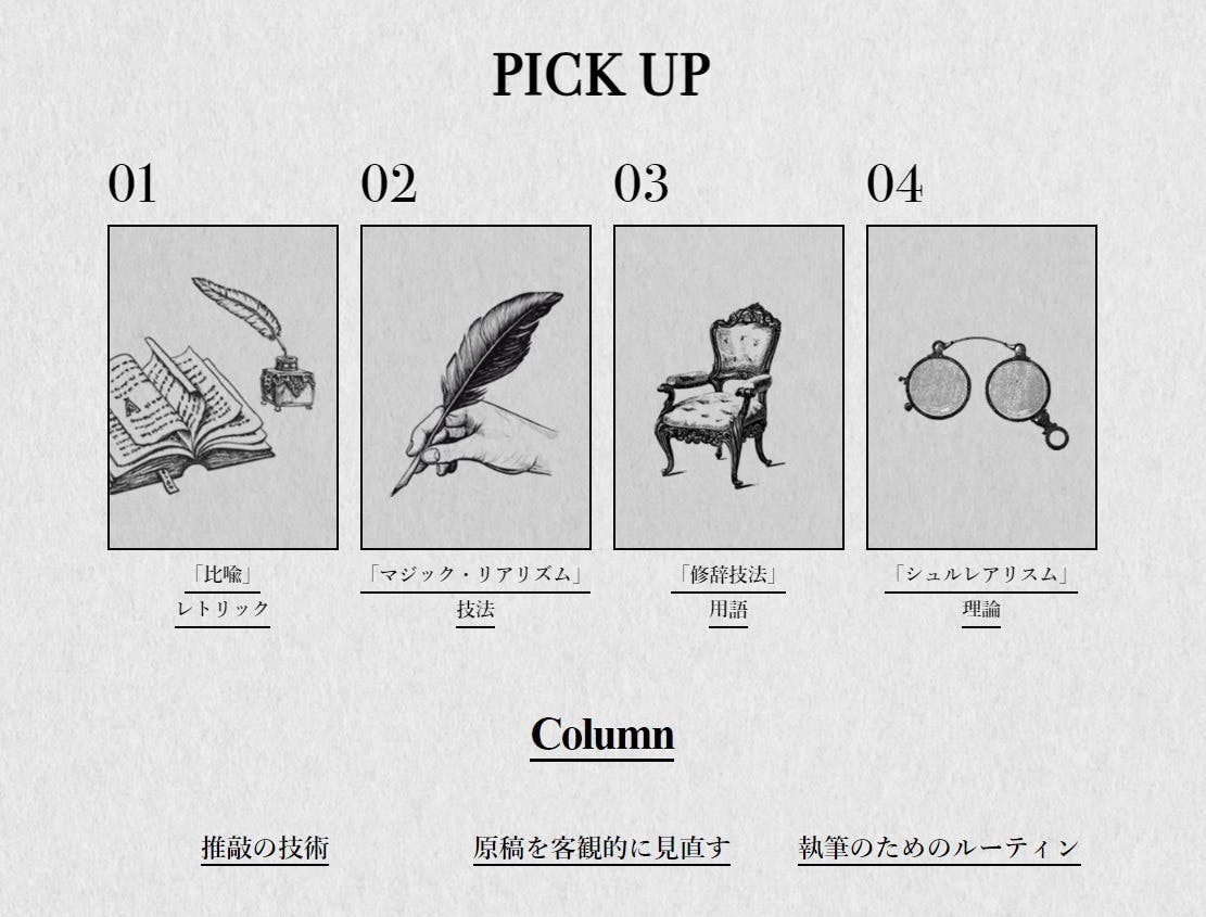 現状では創作における基礎知識である「レトリック」や「技法」、「用語」、「理論」などの解説文を多数掲載し、月1回更新のコラムでは「執筆プロセスでためになる情報」を公開しています。