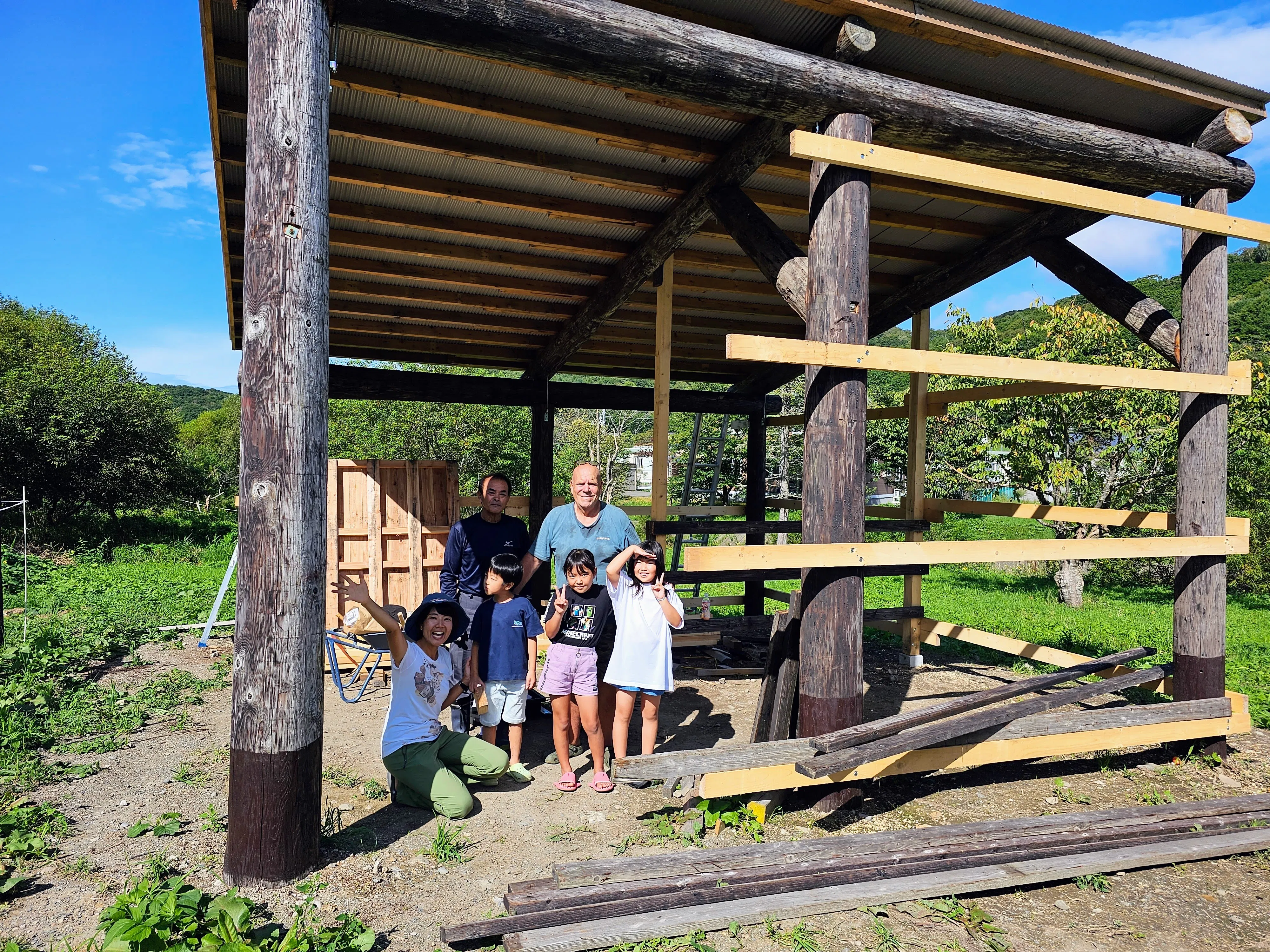 「今日の一枚」は、うちの馬たちが入居予定の馬小屋前で撮った、スクールの子ども達とスタッフの集合写真です。地元の電機会社「株式会社 坂本電建」様からいただいた古い木製電柱を柱に使い、木造伝統工法を得意とする足寄町の「株式会社 木村建設」様に原始的な建築手法で組み上げていただいた、立派な馬小屋です。