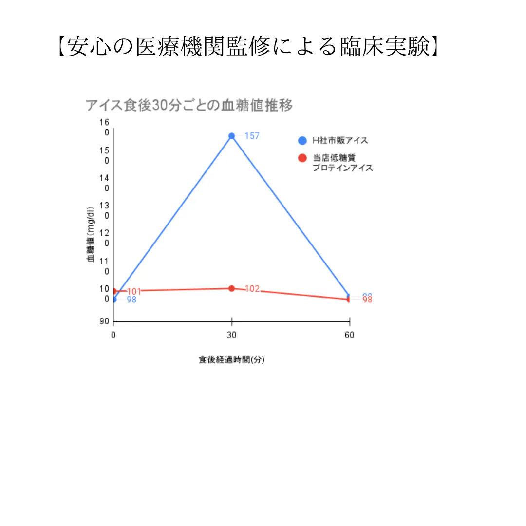医療機関ご協力のもとアイスを食べた後の血糖値変化を測定しました。市販のアイスが食後30分で血糖値の急上昇が見られたのに対して、当店の低糖質プロテインアイスは血糖値が上昇せず、低糖質なことが証明されています。医師の先生もびっくりな実験結果です。